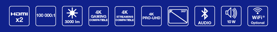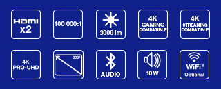 Проекціюйте яскраві яскраві зображення за допомогою цього доступного проектора 4K PRO-UHD1. Завдяки однаково високій інтенсивності білого та кольорового світла до 3000 люменів можна досягти високої яскравості та інтенсивних кольорів. Високий коефіцієнт контрастності 100 000:1 створює глибокі чорні відтінки та чіткі тіні, а інтерполяція кадрів забезпечує чіткіші зображення під час екшенів.