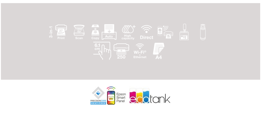 Цей багатофункціональний принтер формату A4, розроблений для домашнього використання та невеликих підприємств, значно знижує витрати та забезпечує високу швидкість друку без необхідності постійно міняти картриджі та тонери. Завдяки передньому пристрою подачі паперу на 250 аркушів, сенсорному РК-екрану 6,1 см і автоматичному пристрою подачі документів на 35 сторінок ви можете друкувати практично безкінечно.