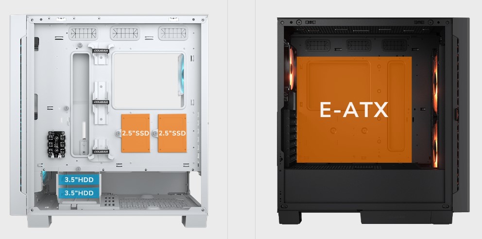 Airface ECO RGB вміщує до 2 твердотільних накопичувачів розміром 2.5 дюйма та 2 жорсткі диски розміром 3.5 дюйма. Корпус сумісний із материнськими платами Mini-ITX, Micro-ATX, ATX, CEB та E-ATX, що забезпечує гнучкість для різних конфігурацій збірки.