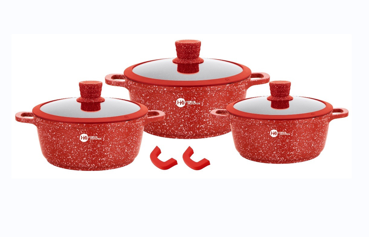 Набір із граніту. Посуд має індукційне дно, що робить його сучасним. До комплекту входить 3 гранітні котла з кришками, а також у комплекті 2 накладки для ручок. 3-шарове антипригарне покриття не впливає на смак і запах їжі та запобігає пригоранню. Цей кухонний набір не містить шкідливих речовин у своєму складі та дає змогу готувати їжу з мінімальною кількістю олії. Ідеально для приготування низькокалорійної, дієтичної їжі. Унікальне індукційне дно TURBO INDUCTION економить 35% енергії, забезпечуючи рівномірний розподіл тепла на всій площі посуду. Набір посуду Higher Kitchen підходить для всіх різновидів плит: газових, електричних, індукційних, галогенних і склокерамічних. Можна мити в посудомийній машині, готувати в духовці.