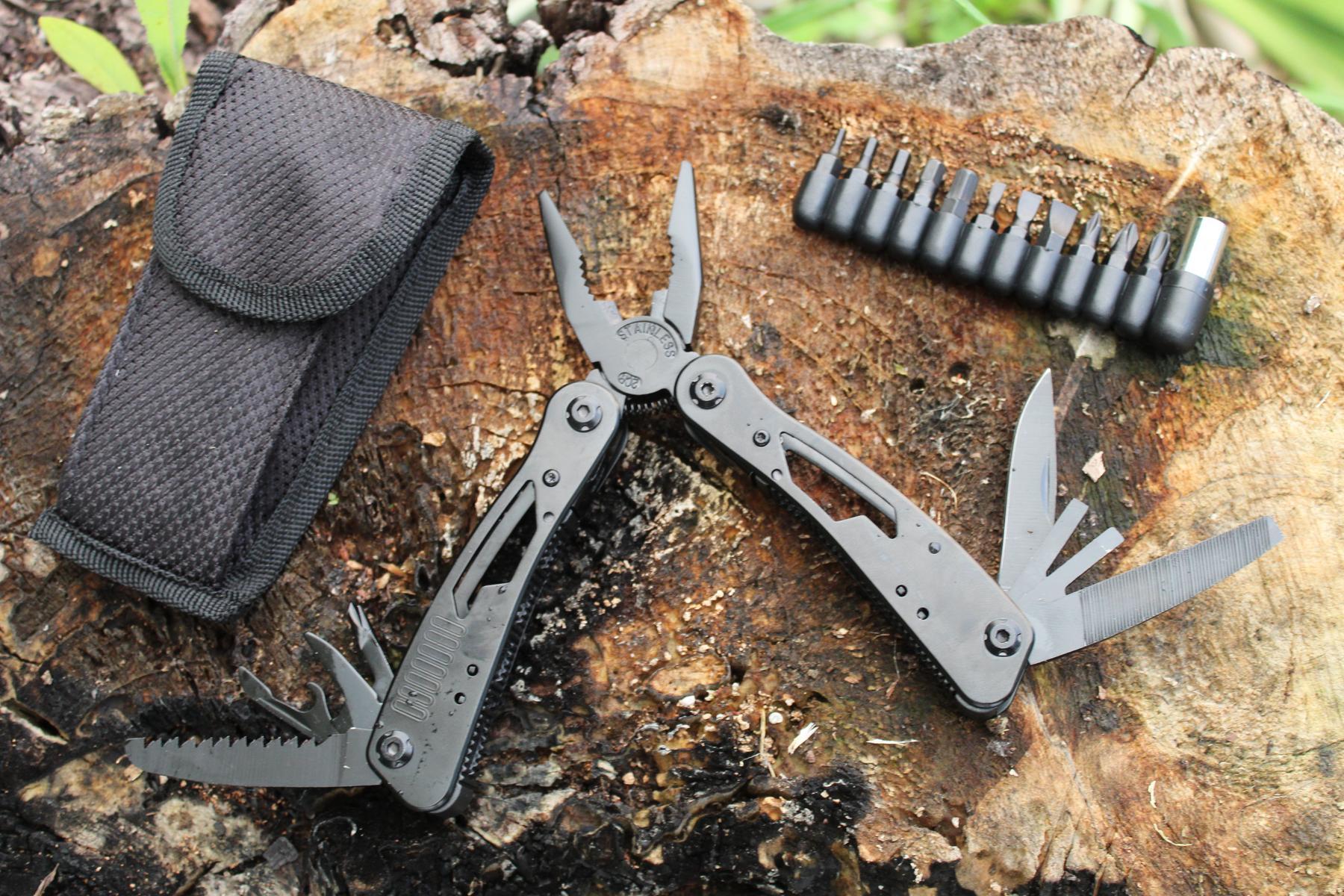 Комплектація: - Плоскогубці, Пилка, Ніж, Пилочка, Викрутка +, Викрутка -, Квадрат, Відкривашка1, Відкривашка2, Набір насадок на квадрат 12шт;
