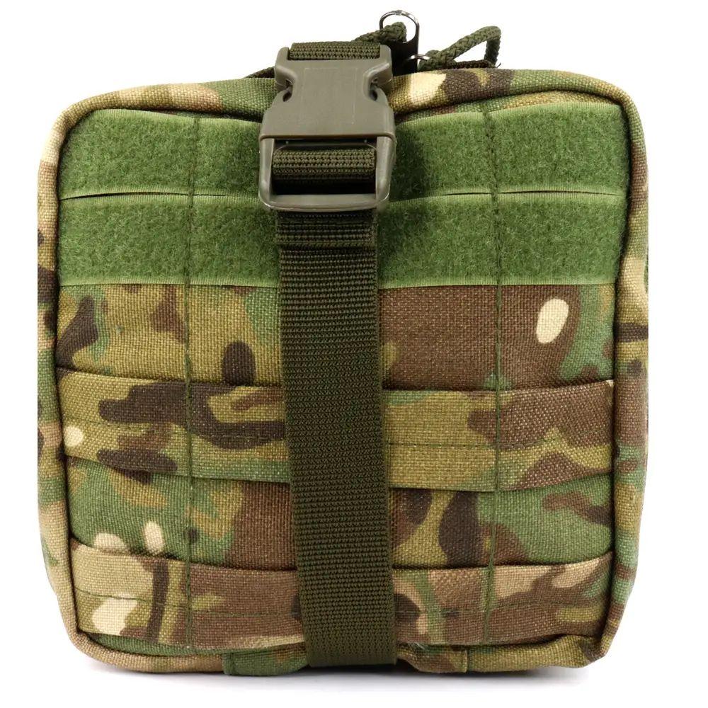 Має основне відділення з трьома кишенями та резинками для фіксації бинтів та ін. препаратів, що закривається на блискавку. На фасаді аптечки наша система молле для кріплення додаткових підсумків. Підсумок може бути використаний як утилітарний для перенесення фотоапарата, боєприпасів, інструментів або іншого приладдя. Кріплення – система молле. Матеріал: кордура 1000 Den. Це тільки підсумок без медичних припаратів.