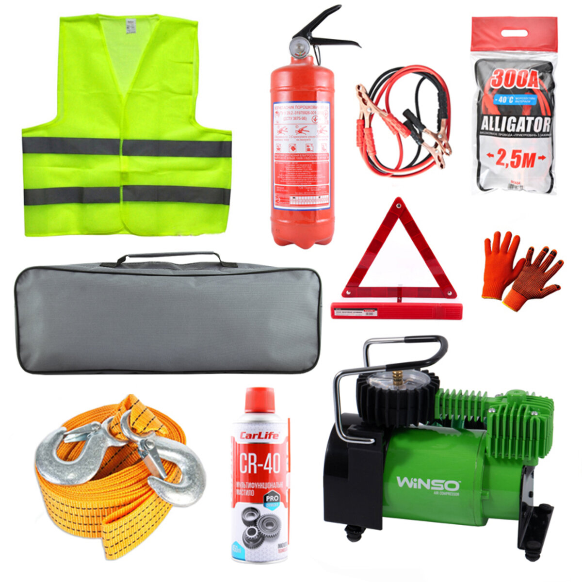 Набір складається: Компресор автомобільний Winso з автостопом 124000 Провода-прикурювачі Alligator 300A, 2,5м BC634 Буксирувальний трос Carlife 4,5т, 5м TR705 Знак аварійної зупинки Вогнегасник порошковий ВП2 VP2-X 2кг Жилет сигнальний Beltex, розмір XXL 19100 Змазка багатофункціональна CarLife CR-40 Multifunctional Lubricant, 450мл CF452 Рукавиці покриті латексом WG09 Cумка органайзер велика Розмір (ШхВхГ): 58 х 18 х 13 см Колір сумки може змінюватись, уточнюйте наявність у менеджера