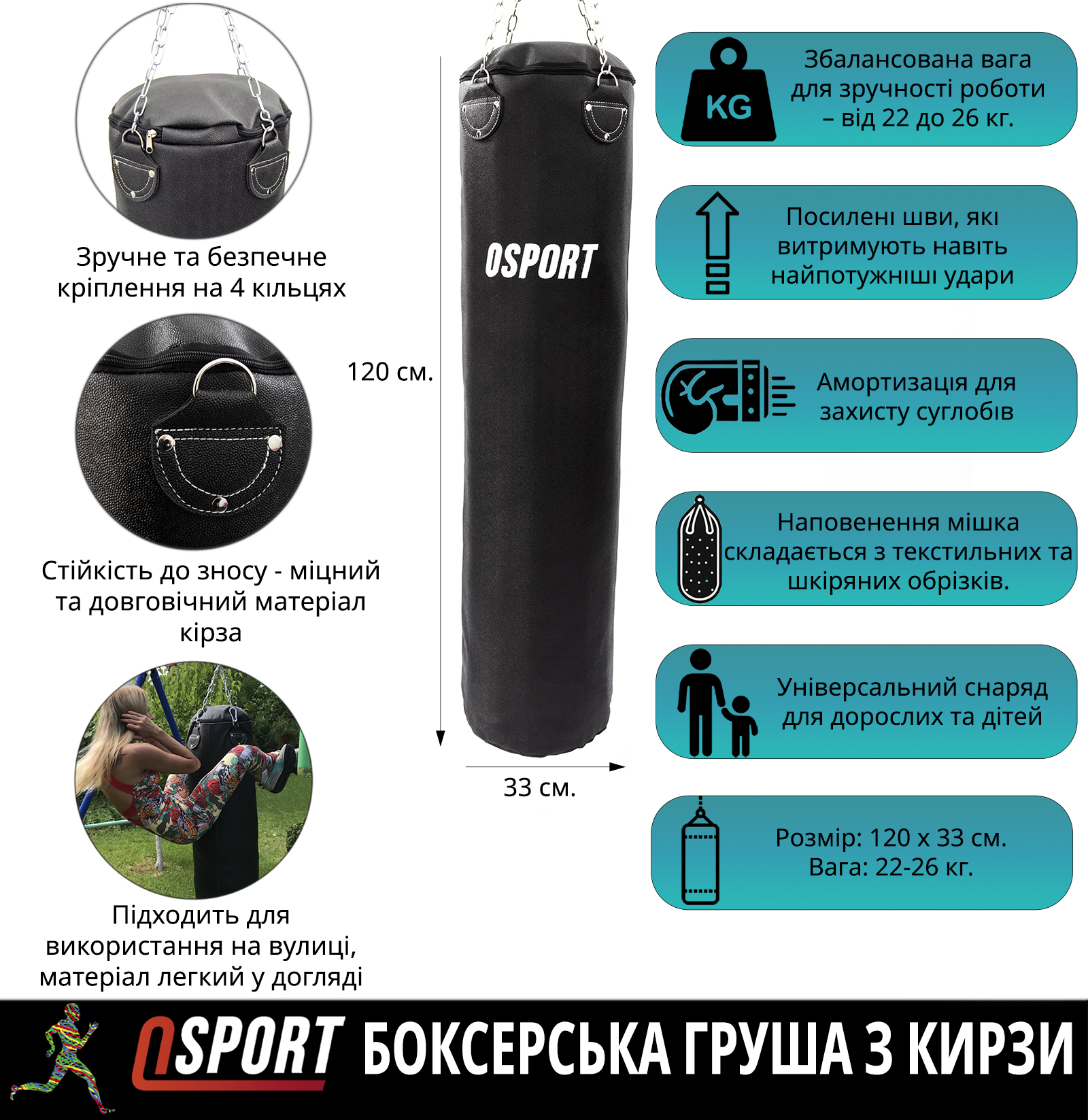 Кірзовий боксерський мішокOSPORT Pro 1,2м наповнений обрізками шкіри та текстилем, наповнювач не схильний до гниття і розпаду. Снаряд відноситься до аматорського класу обладнання для спорту. Може застосовуватися як в умовах квартири, так і спеціалізованих боксерських клубах. Удари завдавати допускається лише у боксерських рукавичках.