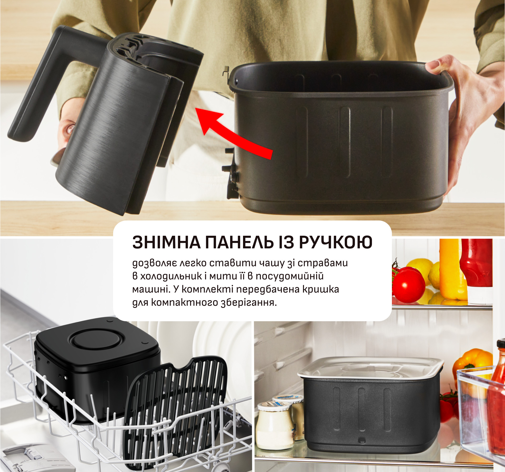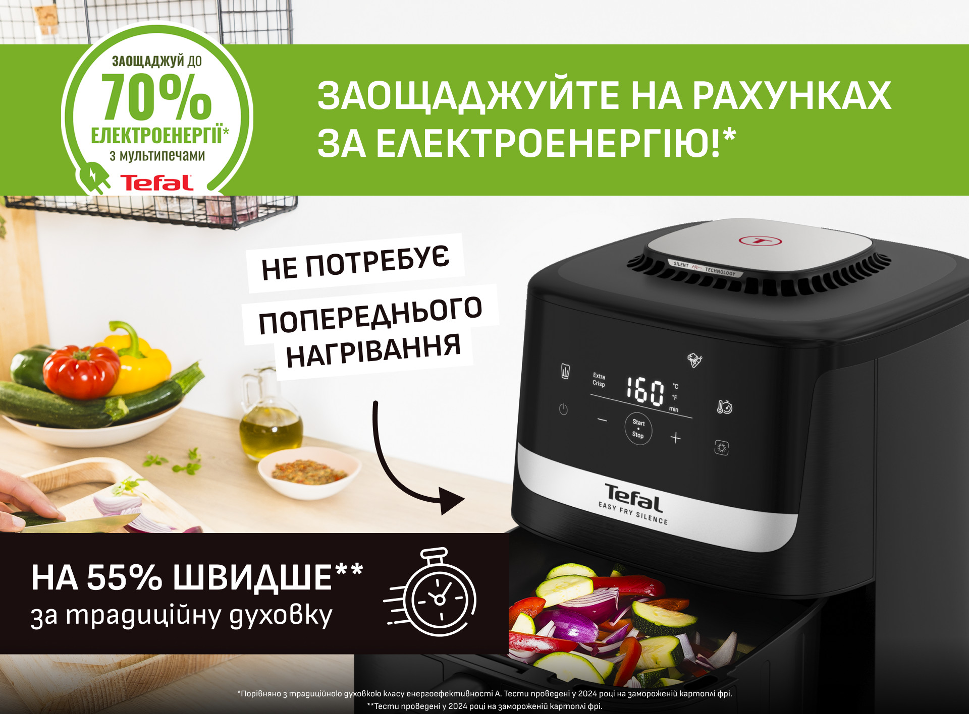 Відкрийте для себе Tefal Easy Fry Silence – найтихішу мультипіч, створену для ідеальних результатів у надзвичайно тихому режимі. Завдяки Tefal Silent Technology та потужному мотору з оптимізованим повітряним потоком ця модель забезпечує ідеальну хрустку скоринку, працюючи до 4 разів тихіше, ніж попередні моделі. Насолоджуйтеся приготуванням без зайвого шуму та з максимальною зручністю. Знімна передня панель спрощує очищення та зберігання, а сенсорне керування робить процес ще комфортнішим. До того ж, ця мультипіч споживає на 70% менше енергії, ніж традиційні духовки.
