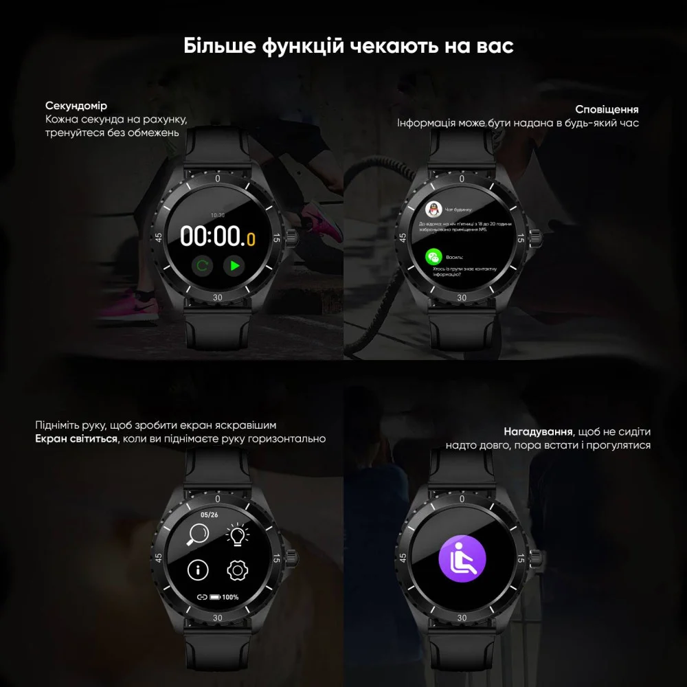AMOLED-екран забезпечує яскраве зображення , зручне навіть на сонці, а захист IP68 дає змогу використовувати годинник навіть у складних погодних умовах.