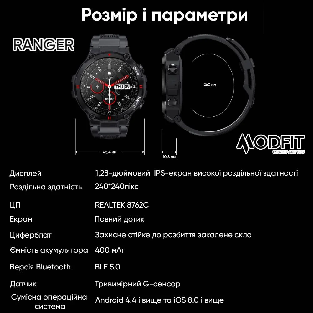 Modfit Ranger Grey — це також практичний ґаджет для повсякденного використання : отримуйте повідомлення, відповідайте на виклики та керуйте музикою через Bluetooth, не витягуючи телефон. Його водозахист IP68 дає змогу носити годинник під час дощу, потовиділення або навіть у воді, не турбуючись про пошкодження.