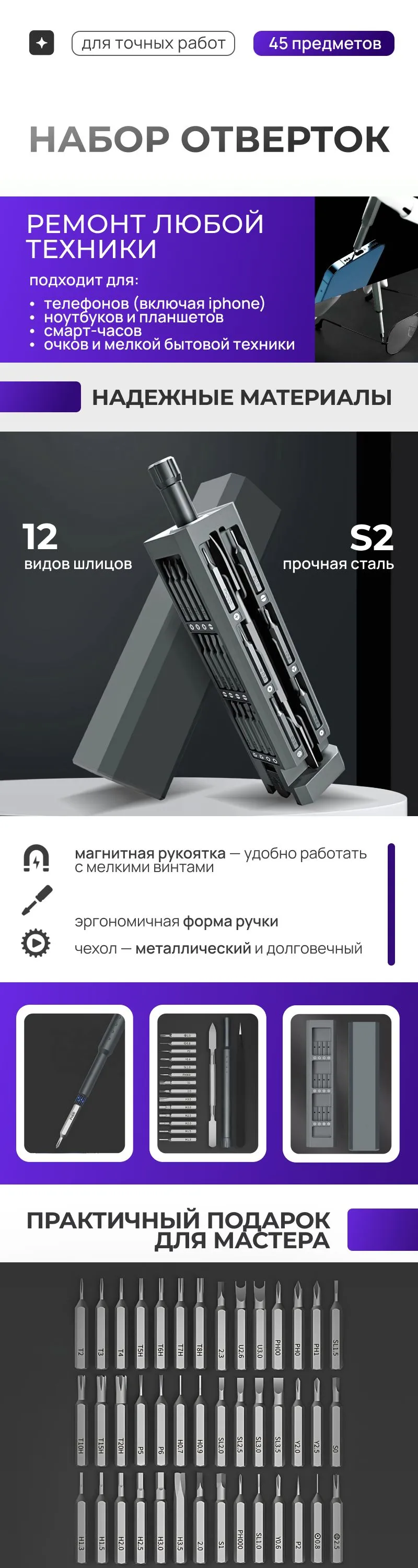 Тримач біт — 1 шт.; Кейс металевий — 1 шт.; Набір біт — 45 шт (Бити в комплекті PH1,0,00,000/SL14, 5H, 6, 5H, 7H, 10H, 15H, 15H, 20H/ 3, 3, 20, 32, 0, 8, 8, 8, 10 см 0.5 / Spl / 20 °C; 2,5 см Пінцет — 1 шт.; Лопатка-спуджер — 1 шт.