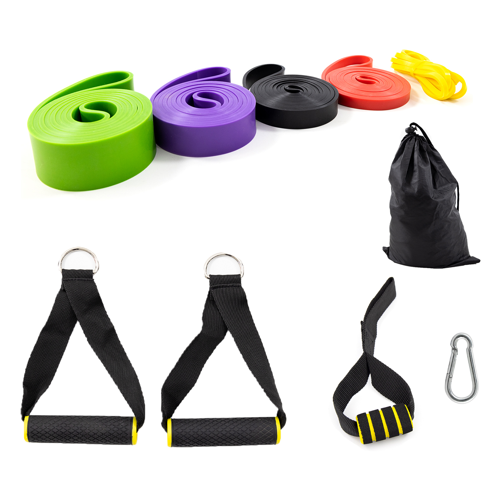 Універсальний набір для тренувань, що складається з 5 гумок для підтягувань з навантаженням від 2 до 57 кг, двох ручок для тяги (грипси) та дверного якоря для кріплення еспандерів.