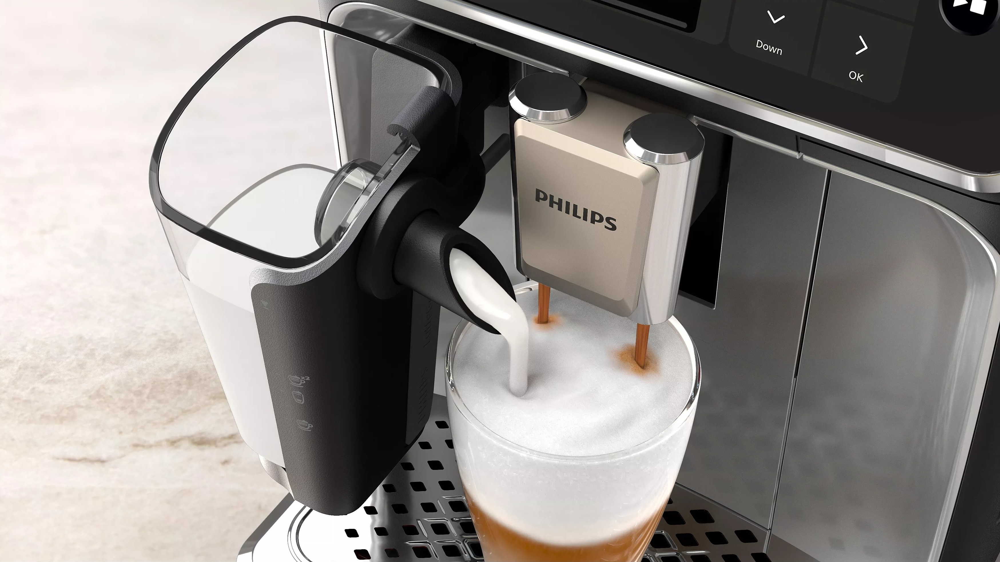 Одним натисканням кнопки LatteGo автоматично готує кавові напої із шовковисто м’якою молочною пінкою завдяки потужній технології піноутворення в циклонній камері — навіть із можливістю додавати ваші улюблені рослинні замінники молока.