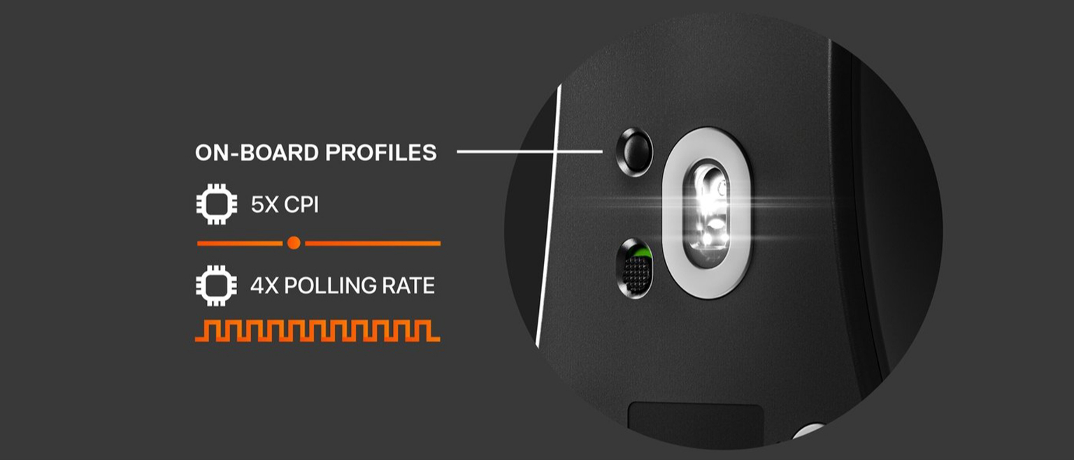 Незамінна функція для турнірів: налаштування продуктивності можна змінювати на льоту. На вибір доступні 4 варіанти частоти опитування і до 5 стандартних або кастомних значення CPI. Встановити потрібні значення можна безпосередньо на миші, що моментально адаптує пристрій до запущеної гри.