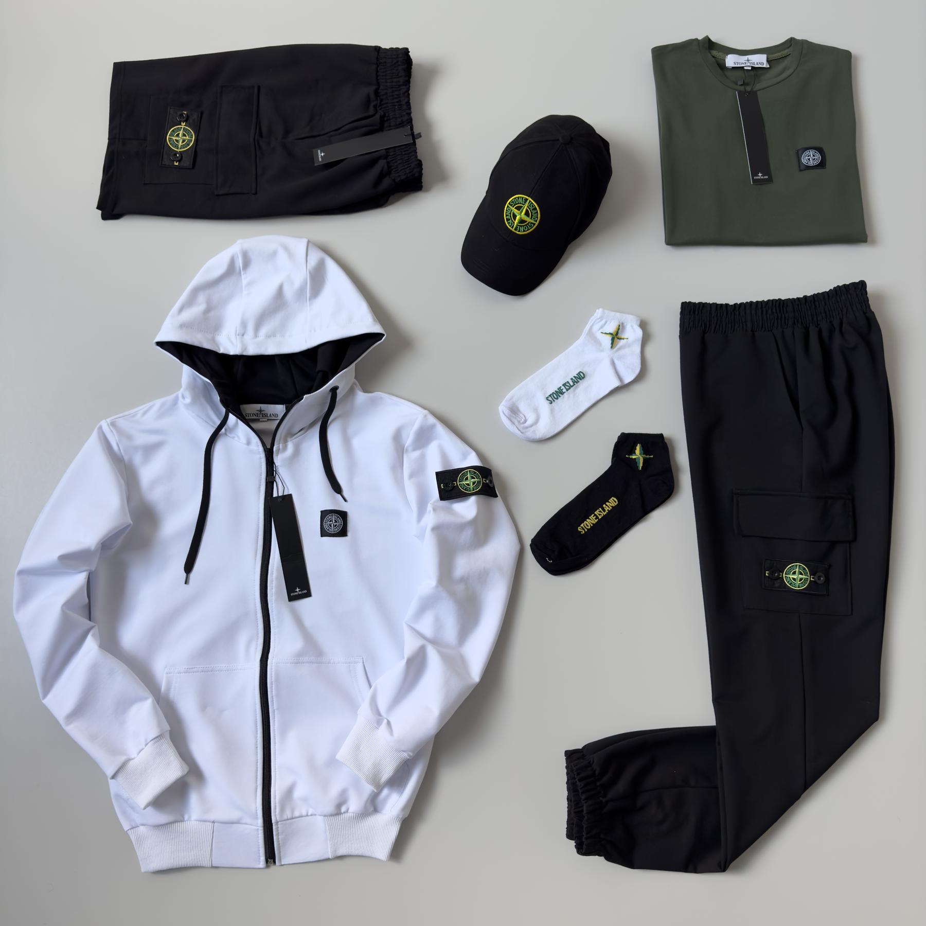 Набір 7в1 Stone Island білий зип худі чорні штани шорти чорна кепка футболка 2 пари шкарпеток BZN