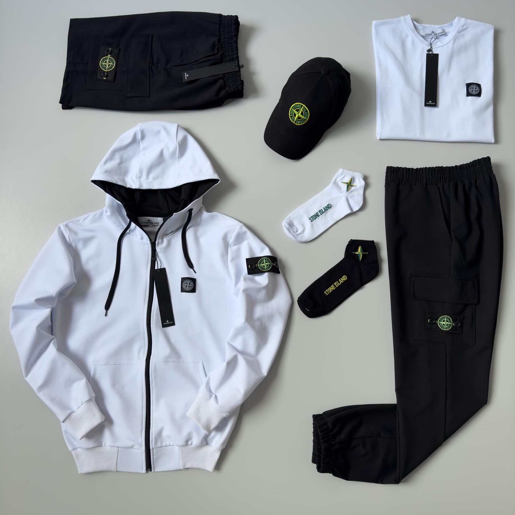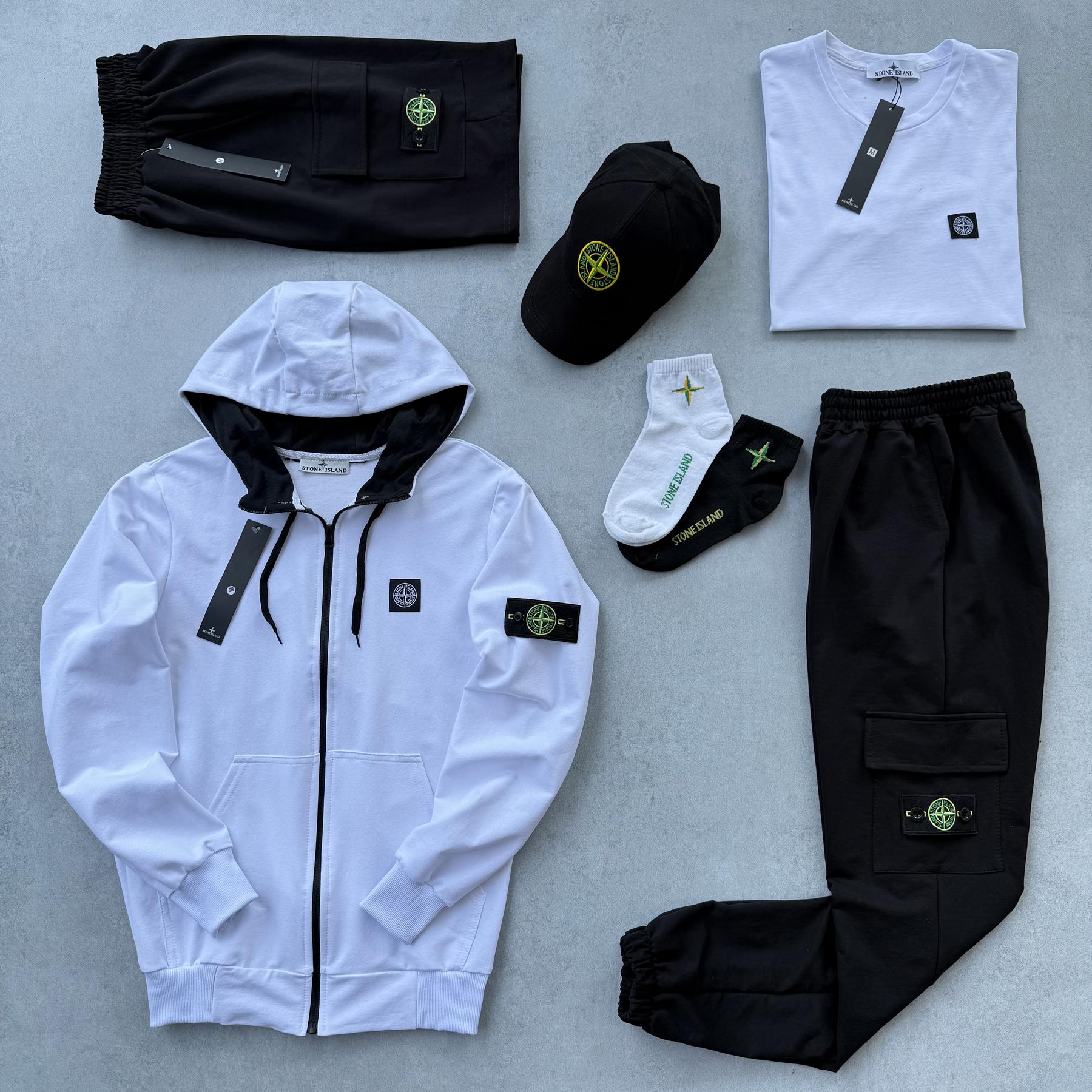 Набір 7в1 Stone Island білий зип худі футболка чорні штани шорти кепка 2 пари шкарпеток BZN
