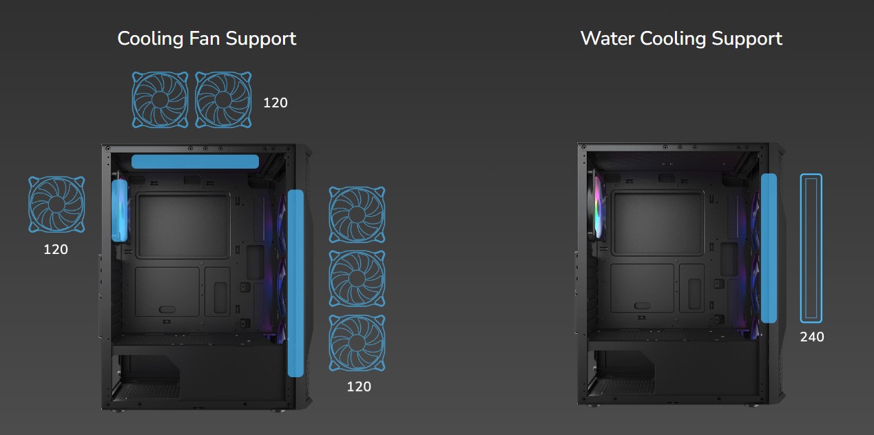Попередньо встановлені 3x 120-мм вентилятори RGB з фіксованим режимом спереду і додатковий 120-мм вентилятор RGB ззаду охолоджують вашу систему з коробки, надаючи їй стильний вигляд, який можна розширити до 6x 120-мм вентиляторів. Підтримка водяного радіатора до 240 мм АБО повітряного охолодження висотою до 158 мм гарантує, що ваша установка буде підтримувати оптимальну температуру навіть за високого навантаження.