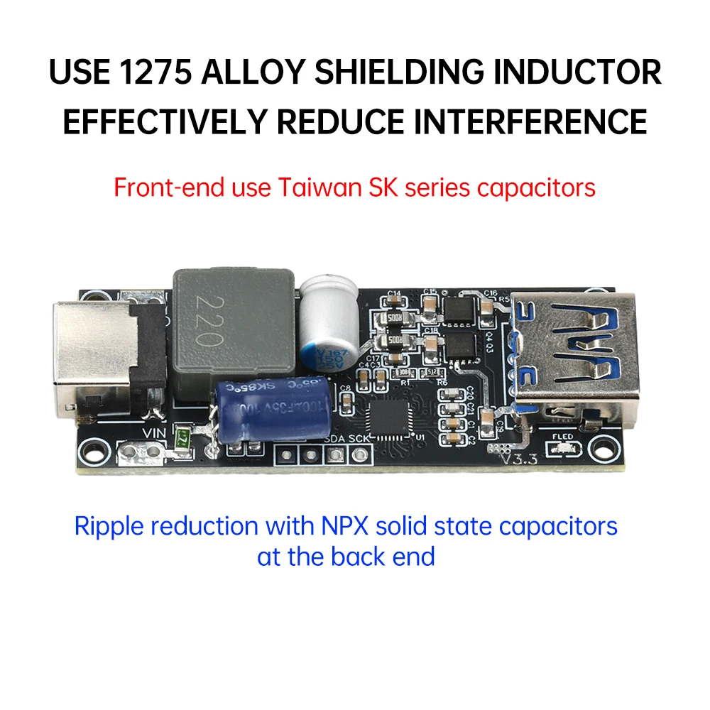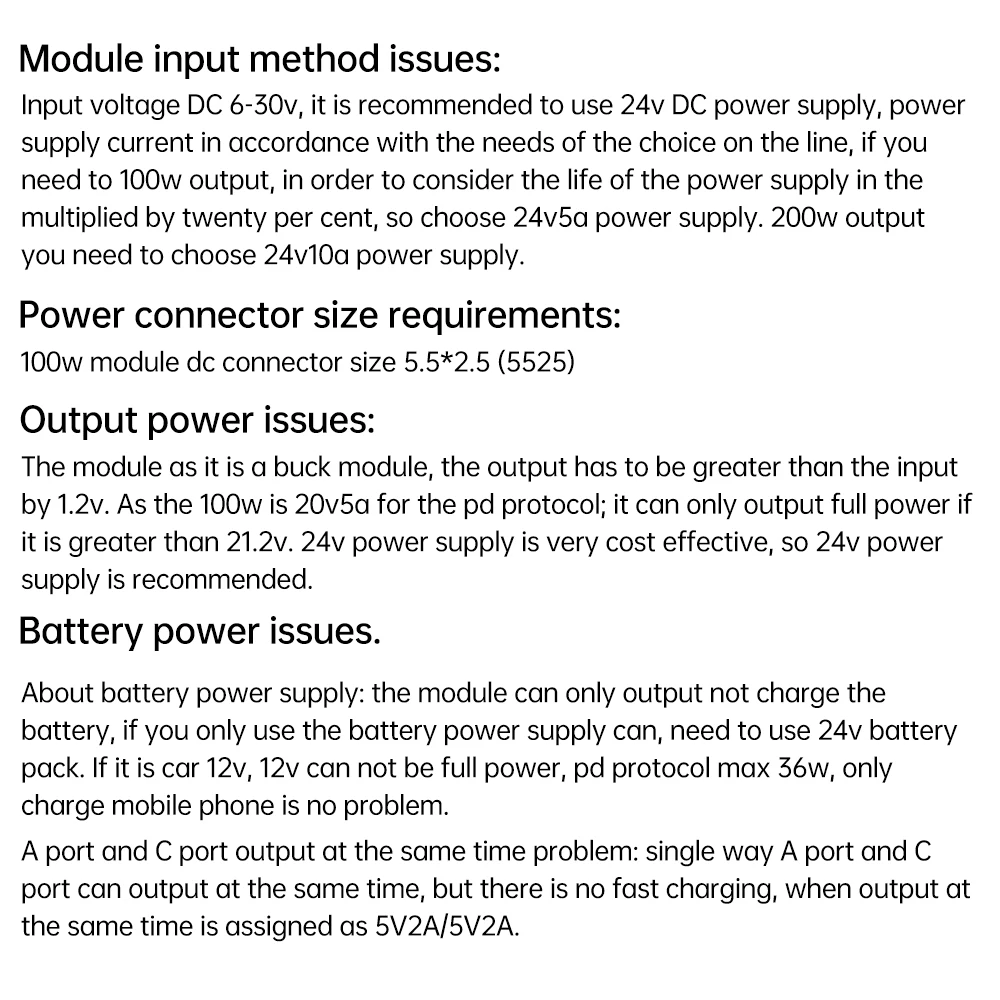 Проблема вихідної потужності: оскільки модуль є знижувальним, вихідна напруга має бути більшою за вхідні 1,2 В. Оскільки 100 Вт відповідає протоколу PD 20 В 5 А, то повна вихідна потужність можлива тільки за напруги понад 21,2 В. Джерело живлення 24 В дуже економічно ефективне, тому ми рекомендуємо саме його.