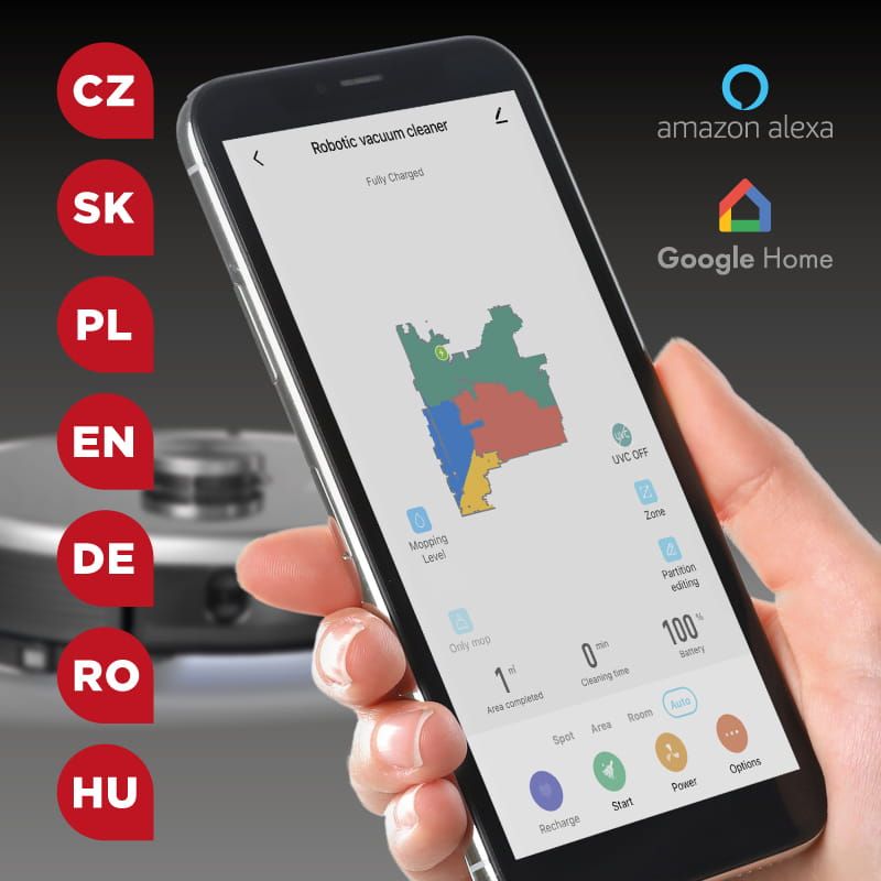 Роботом можна керувати за допомогою додатку Concept Home, який доступний польською мовою і є безкоштовним для iOS та Android. За допомогою програми ви можете планувати прибирання та контролювати його в режимі реального часу. Навіть якщо вас немає вдома, у вас завжди буде все під контролем. У додатку ви також можете встановити мову, якою робот буде з вами розмовляти, в тому числі польську. А якщо ви не є прихильником сучасних технологій або не маєте смартфона, ви також можете повністю керувати ним за допомогою пульта дистанційного керування. За допомогою мобільного додатку ви можете встановити до 15 зон, в яких робот буде прибирати. У той же час, ви можете визначити заборонені зони, де робот не буде прибирати, або зони без витирання, де робот буде прибирати тільки тоді, коли не встановлено модуль для прибирання.