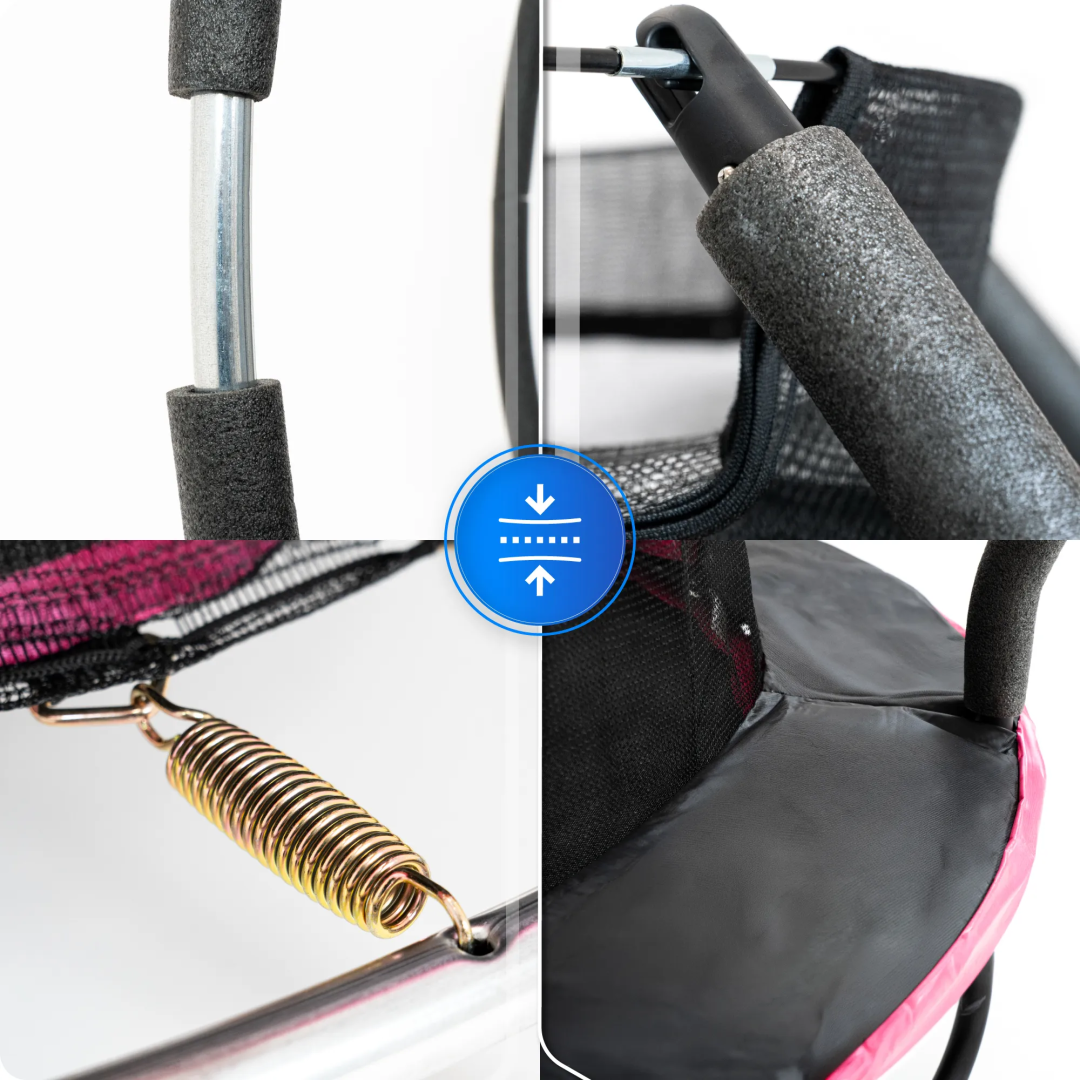 У батуті застосовано посилений захист преміумкласу, виготовлений з матового ПВХ та товстої, 10-міліметрової піни EPE. Таке поєднання забезпечує вищий рівень захисту пружин та більшу безпеку під час використання. Матове покриття надає конструкції сучасний та естетичний вигляд, що значно перевершує стандартні захисні кожухи з поліетилену. Завдяки міцній конструкції захисний кожух є довговічнішим та краще підходить для щоденного тривалого використання.