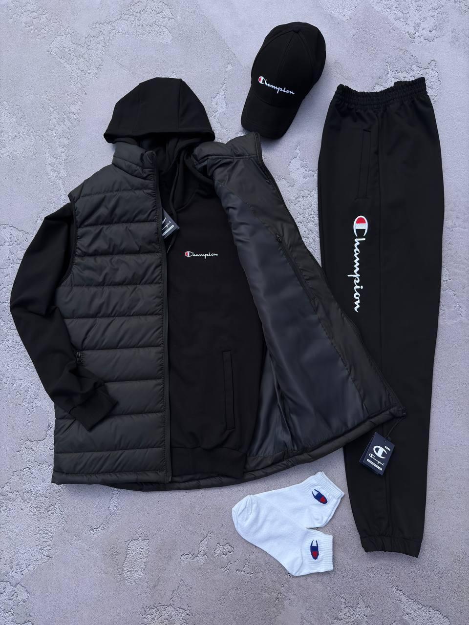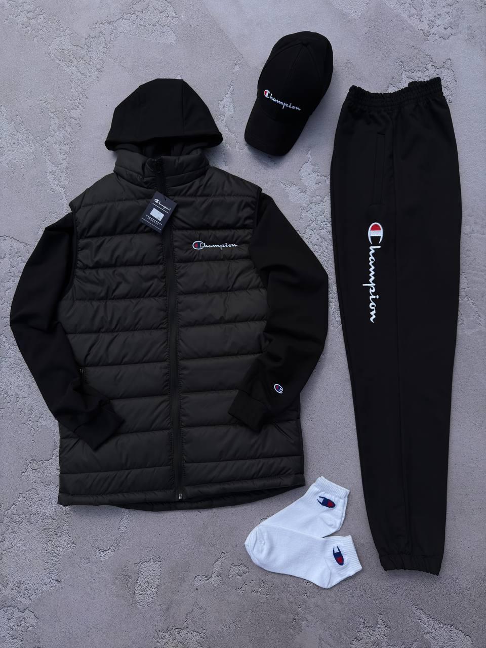 Набір Champ чорний жилет худі штани кепка для чоловіків стильний спортивний комплект BZN