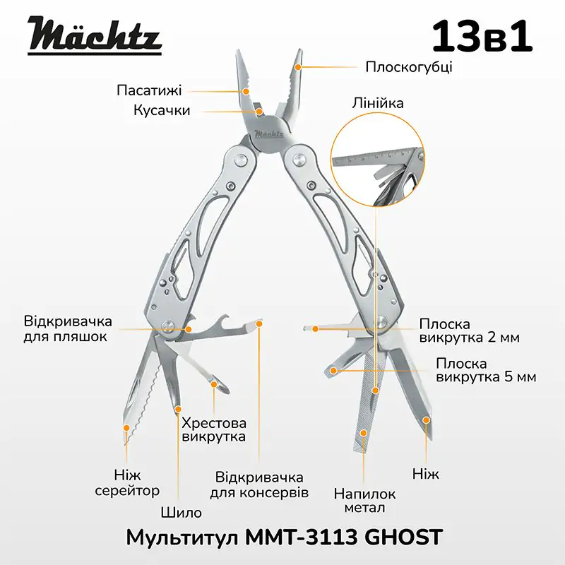 Мультиінструмент Mächtz MMT-3113 GHOST компактний і багатофункціональний інструмент, що стане надійним помічником для туристів, рибалок, мисливців і в повсякденних побутових справах.