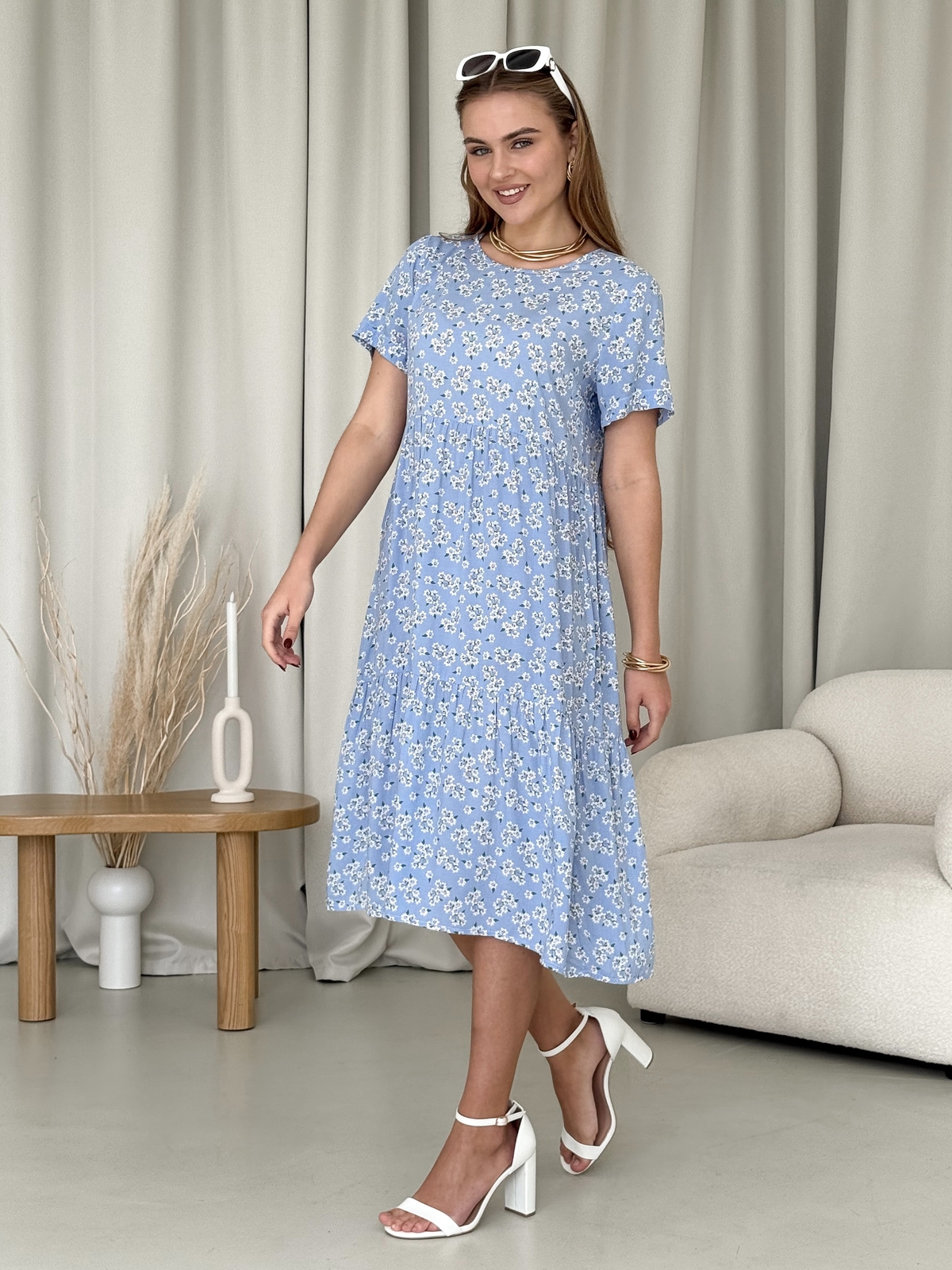 Крій у вигляді трапеції забезпечує свободу рухів і приховує недоліки фігури, що робить сукню придатною для жінок з будь-якими типами фігур. Короткий рукав додає легкості та витонченості, а квітковий принт у блакитних тонах привносить нотку романтики та свіжості у ваш гардероб.