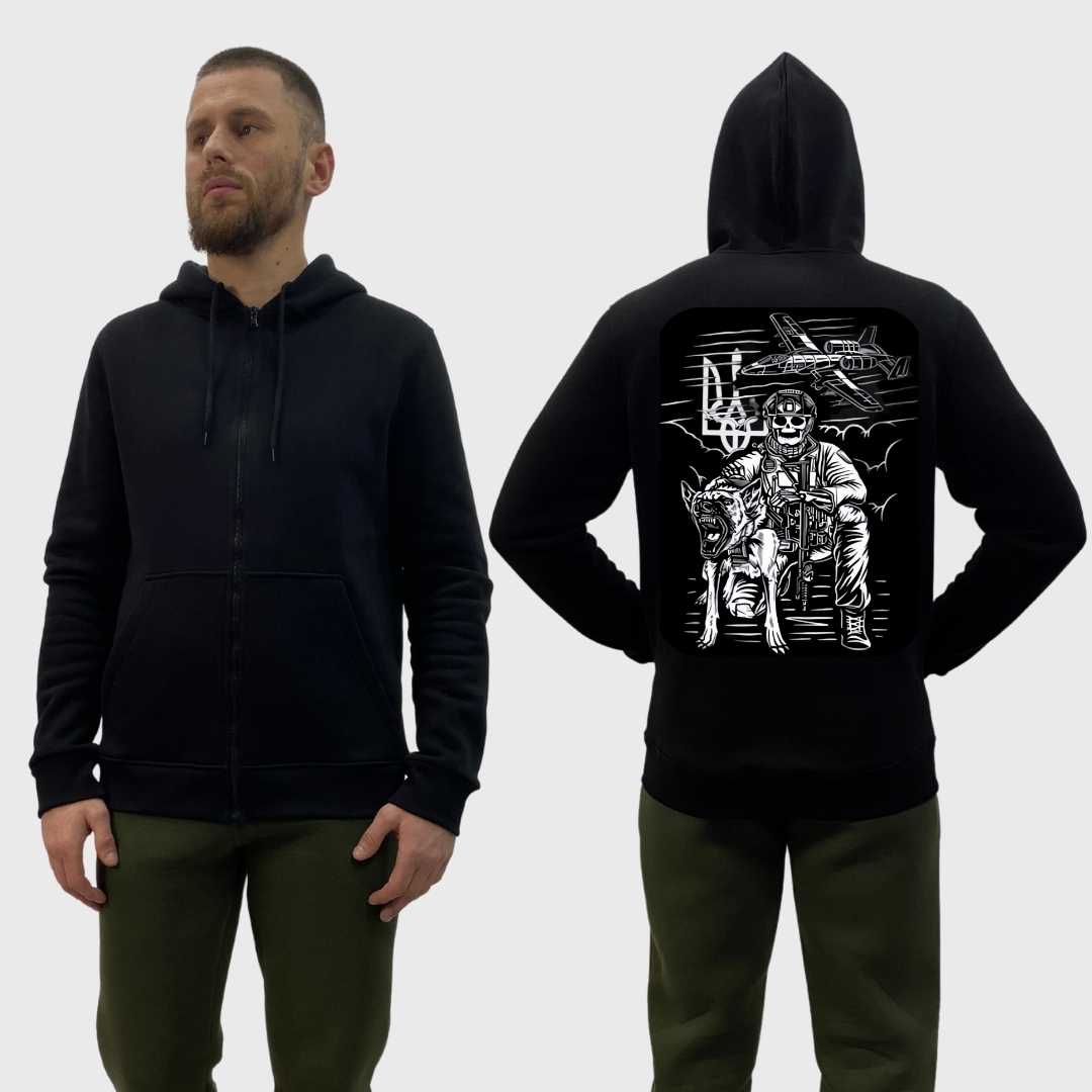 Зробіть свій вибір на користь комфорту та стилю. Замовте чоловічий зіп-худі на флісі з принтом "Скелет з собакою тризуб" вже сьогодні і насолоджуйтеся теплом та елегантністю у будь-яку погоду!