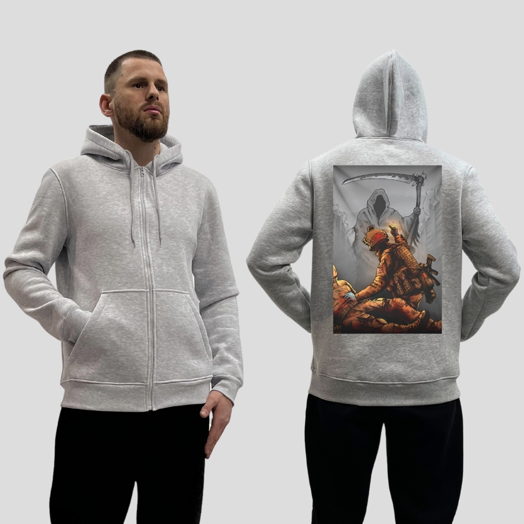 Чоловічий зіп-худі на флісі з принтом "Військовий медик" — це не просто одяг, а стильний елемент вашого гардеробу, який підкреслить вашу індивідуальність. Завдяки трьохнитковій тканині на флісі, цей худі забезпечує відмінну теплоізоляцію, що робить його ідеальним для прохолодних осінніх і зимових днів.