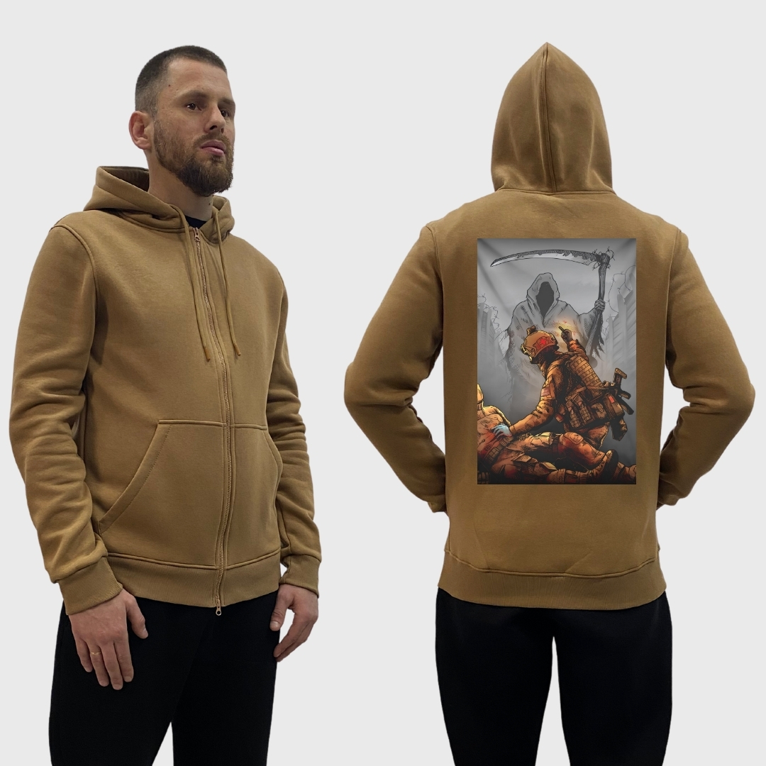 Цей зіп-худі стане чудовим вибором для активних чоловіків, які цінують комфорт і стиль. Його можна носити як у повсякденному житті, так і під час активного відпочинку. Принт "Військовий медик" надає йому особливого шарму та робить його унікальним.