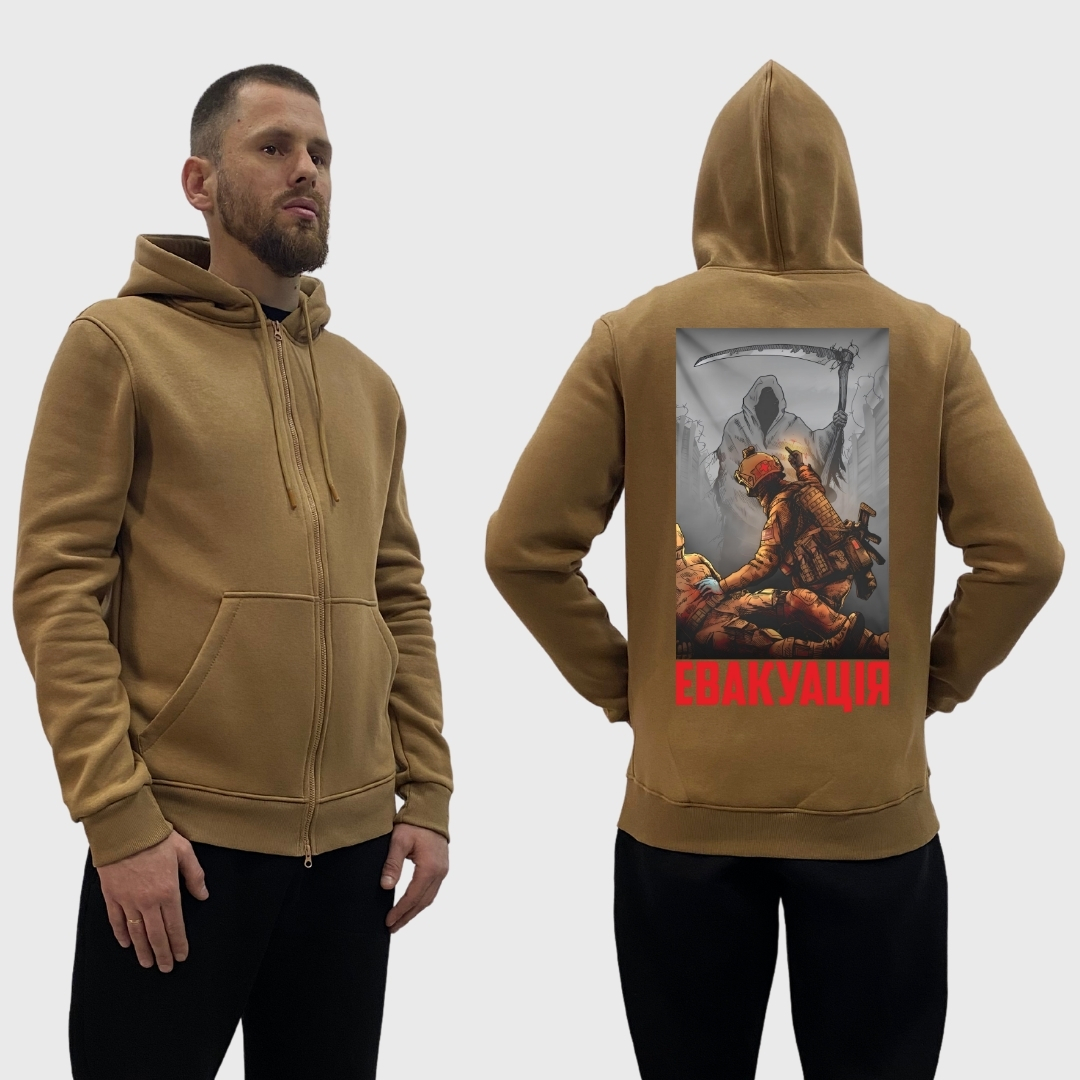 Принт "Евакуація військовий медик фак смерті" привертає увагу та додає оригінальності вашому образу. Зручна блискавка та вшитий капюшон дозволяють швидко адаптуватися до змін погоди, а прямий крій підходить для будь-якого типу фігури, що робить цей худі універсальним вибором для щоденного носіння.