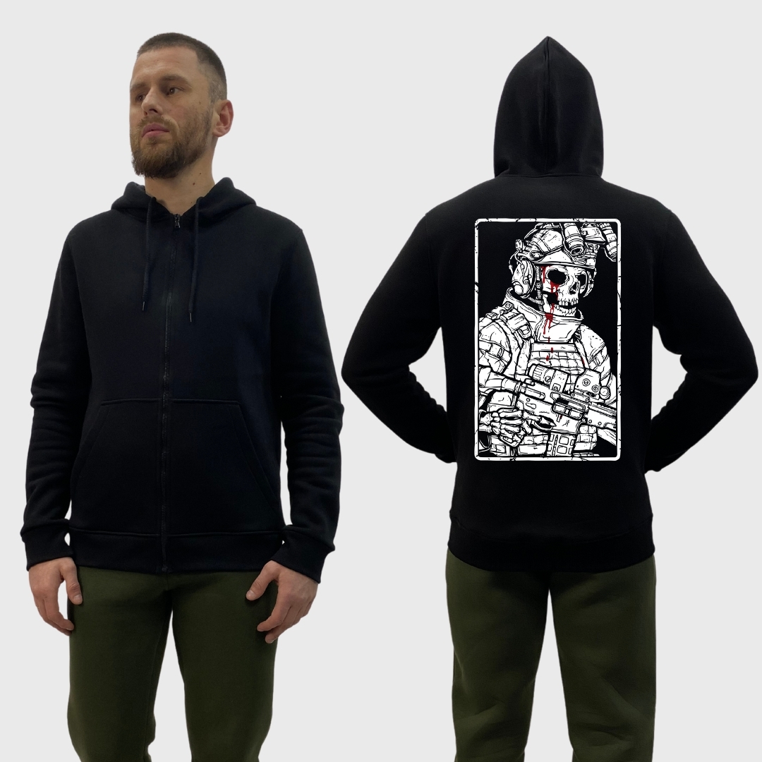 Чоловічий зіп-худі на флісі з принтом "Військовий скелет кров" стане незамінним елементом вашого гардеробу. Виконаний з трьохнитки на флісі, цей худі забезпечить вам тепло та комфорт у холодну пору року. Його стильний дизайн з принтом привертає увагу і підкреслює вашу індивідуальність.