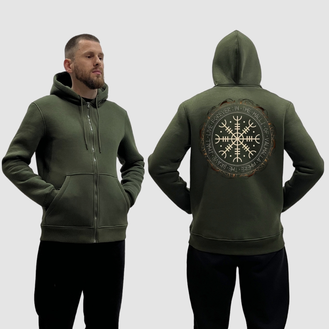 - Чоловічий зіп-худі на флісі з принтом Коло руни, Хакі