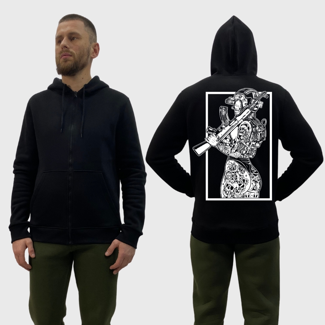 Оригінальний чорно-білий принт з дівчиною з автоматом не залишить байдужим нікого. Цей зіп-худі стане ідеальним вибором для молодих людей, які слідкують за модою і хочуть виділитися серед інших. Ви можете носити його в повсякденному житті, на прогулянках з друзями або навіть на вечірках.