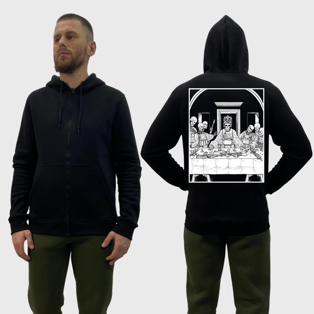 Чоловічий зіп-худі на флісі з принтом Weapon Dealer — це не просто одяг, а стильний акцент у вашому гардеробі. Завдяки високоякісному матеріалу, він забезпечує тепло та комфорт в холодну пору року. Принт у вигляді скелетів, що за столом, надає унікальності та виразності, що робить його чудовим вибором для тих, хто хоче виділитися з натовпу.