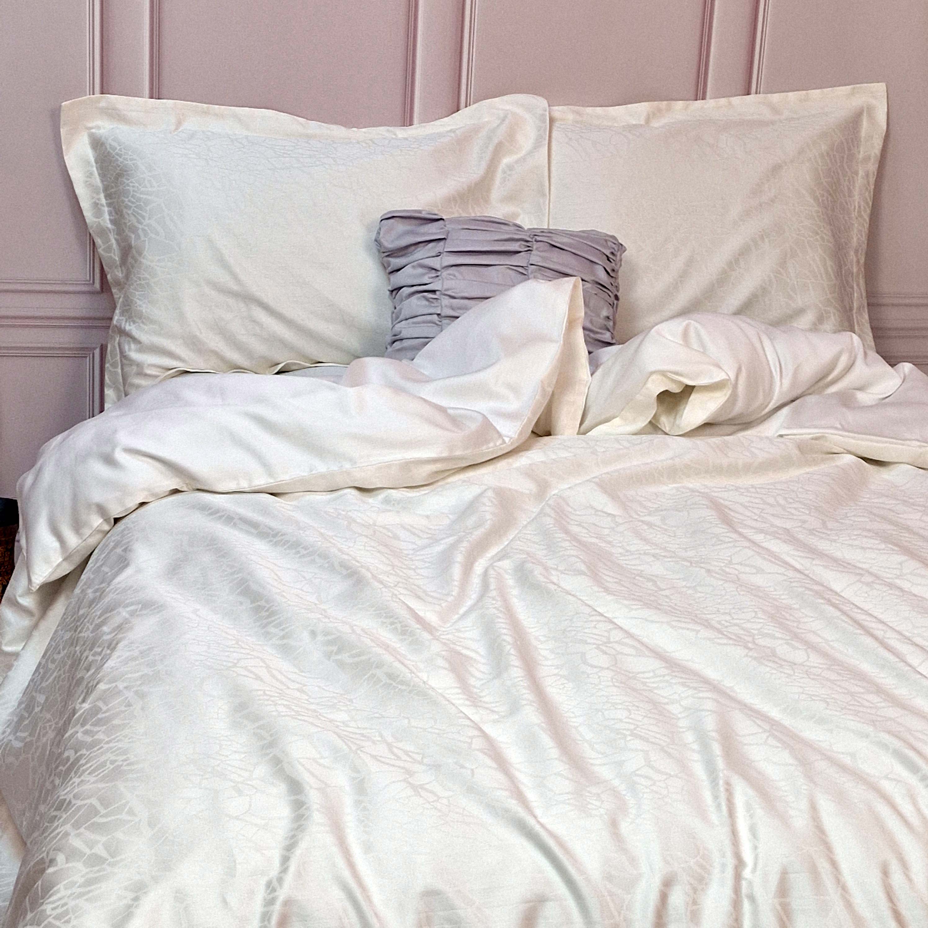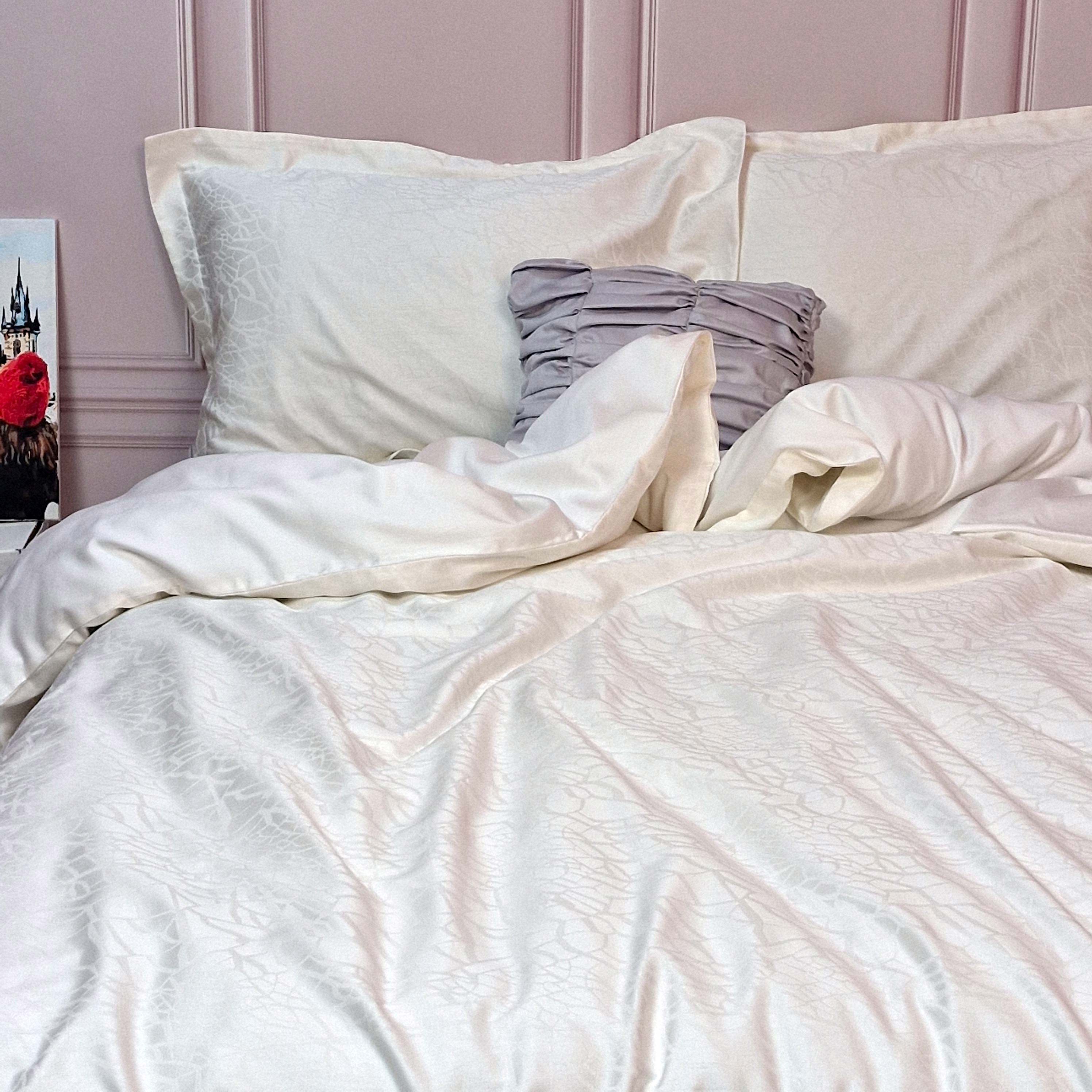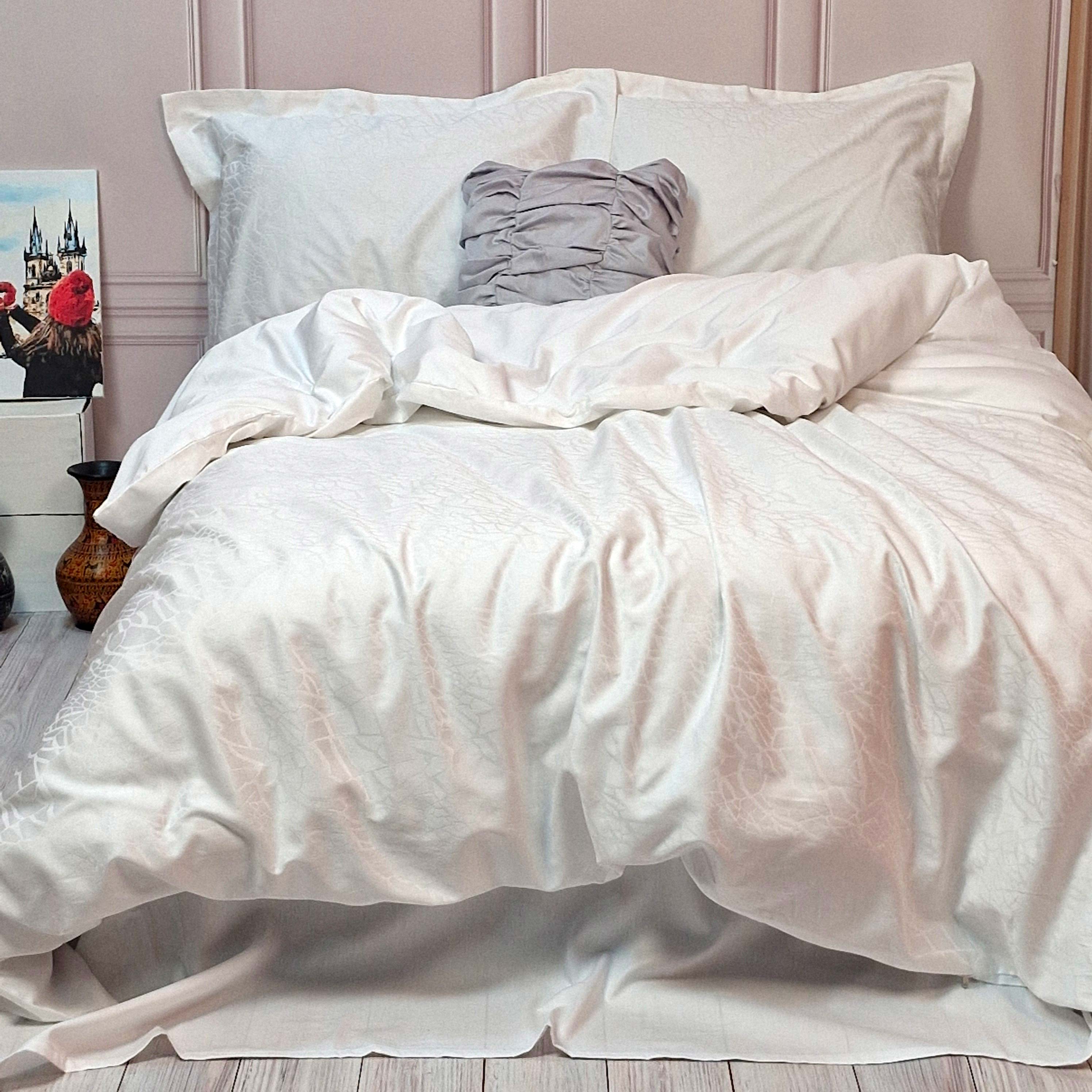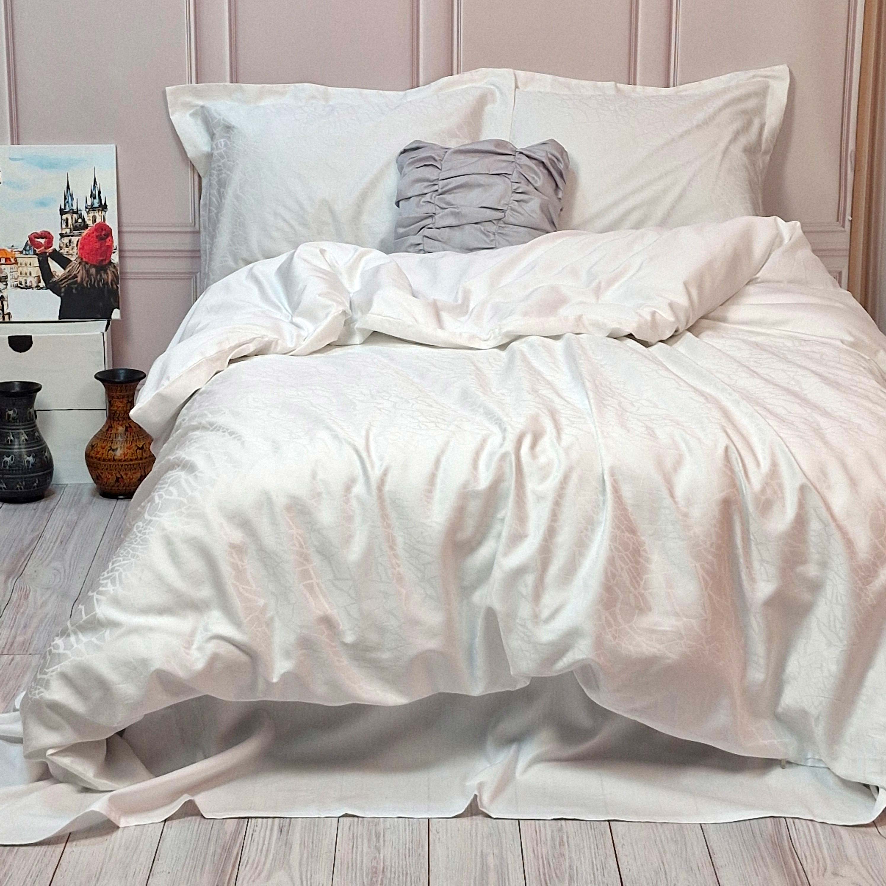 Постільна білизна з сатину жакарду - підковдра двостороння: нижня сторона гладкий сатин, верхня - жакардовий сатин; наволочки - жакардовий сатин; простирадло - гладкий сатин.