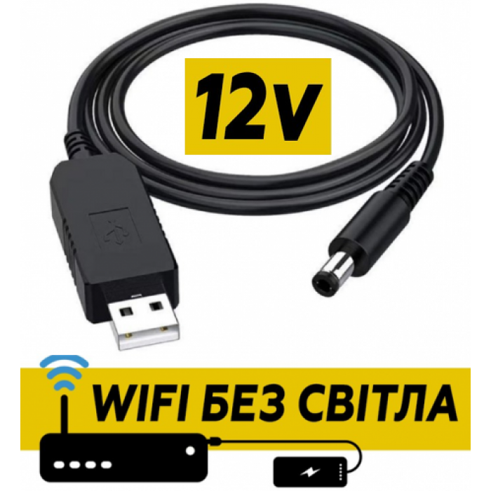 Кабель для роутера від повербанка 12V-перетворювач USB 5V-gt;12V Кабель перехідник 12 В, DC 5.5x2.1 мм для живлення роутера від Powerbank Кабель перехідник 12V, DC 5.5x2.1mm допомагає у разі вимкнення електрики живити роутер від повербанка та далі користуватися інтернетом (якщо провайдер і далі подавати інтернет до роутера).