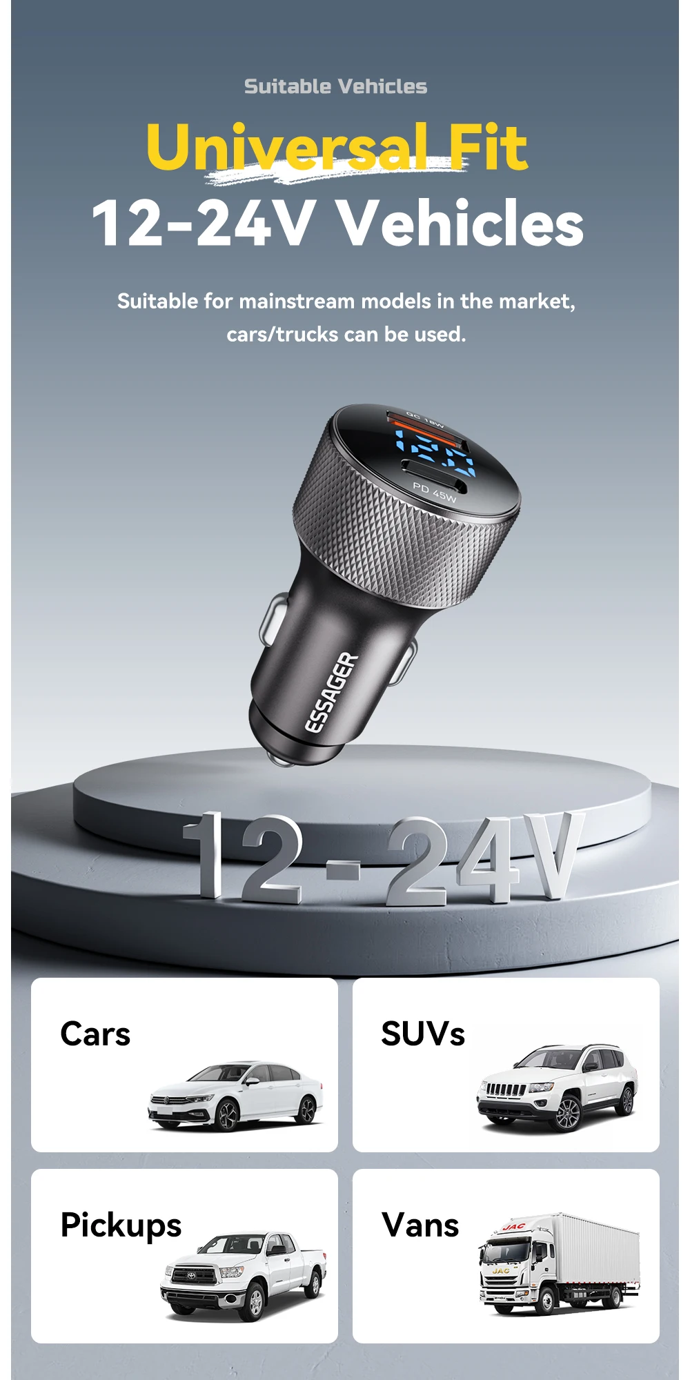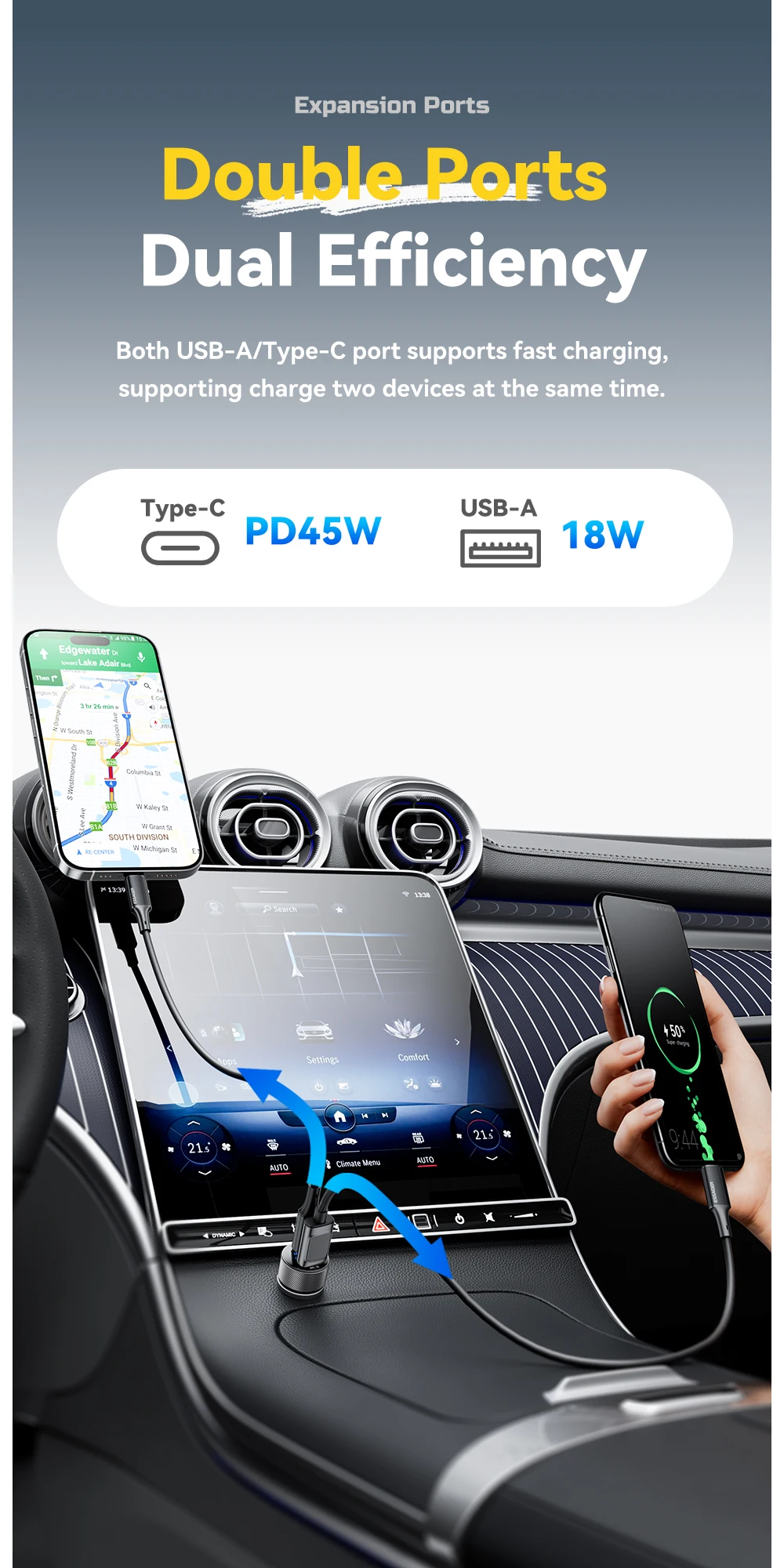 Автомобільний зарядний пристрій Essager 45 W (USB Type-C + USB Type-A) PD3.0 + QC3.0 на 2 USB це компактна та водночас потужна зарядка зроблена за інноваційною технологією з використанням нітриду галію, яка підтримує всі стандарти швидкого заряджання PD3.0, PD2.0, PPS; QC3.0, QC2.0; Huawei FSP, Samsung AFC; SCP, FCP, APPLE2.4, BC1.2, PE+ для заряджання планшетів і смартфонів. Сумісність з Apple, Samsung, Huawei, Xiaomi та іншими виробниками.