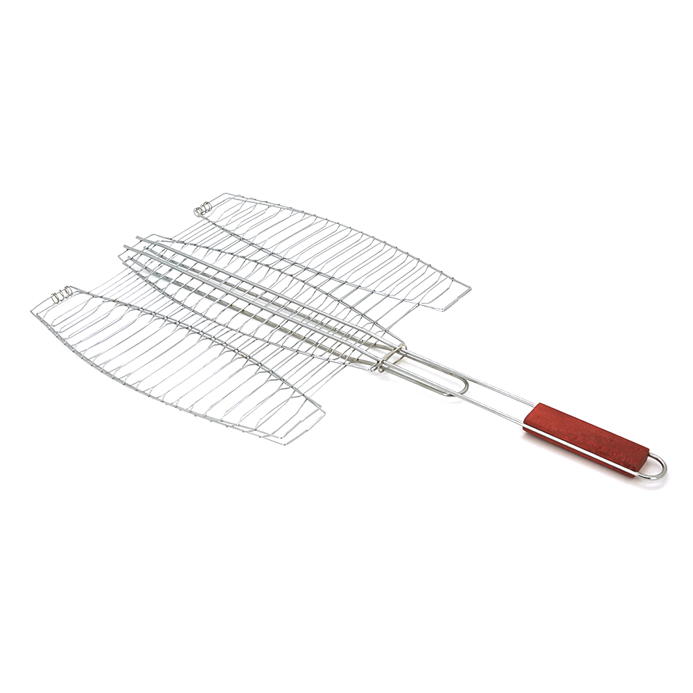 Виготовлена з харчової нержавіючої сталі, ця решітка відрізняється високою міцністю та довговічністю. Її овальна форма забезпечує рівномірне прогрівання їжі, а дерев'яна ручка дозволяє зручно маніпулювати решіткою навіть при високих температурах.
