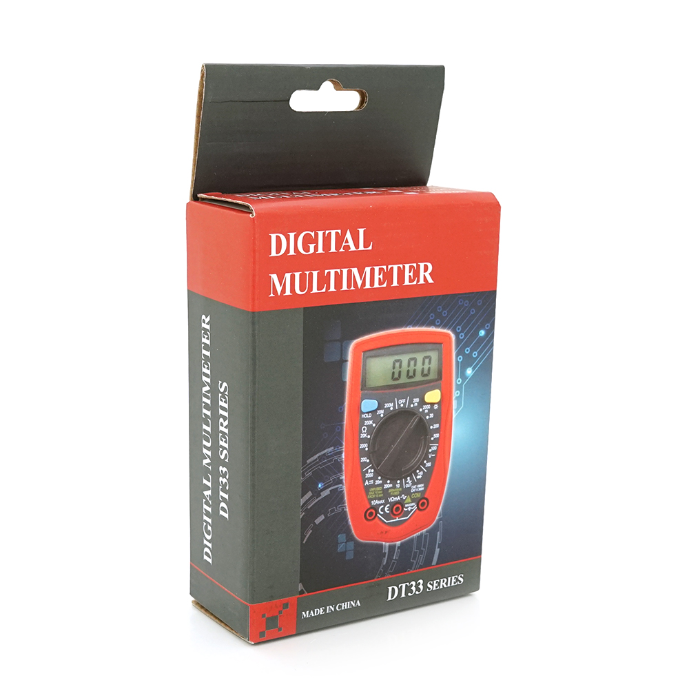 Мультиметр DT33B — це надійний і зручний інструмент, призначений для вимірювання постійного та змінного напруження, постійного струму, опору, а також перевірки діодів і цілісності ланцюга. Він ідеально підходить як для домашнього використання, так і для професійних потреб.