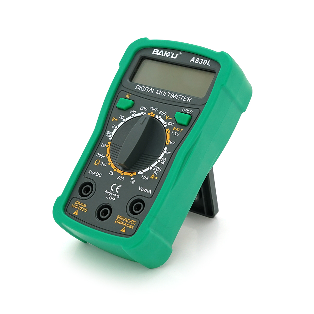 Цифровий мультиметр BAKKU BK-A830L — це надійний інструмент, який допоможе вам вимірювати різні параметри, такі як напруга, струм та опір. З його допомогою ви зможете легко відремонтувати побутову техніку, електроніку автомобіля та мотоцикла, а також перевірити проводку на дачі. Просто встановіть щупи в гніздо, виберіть потрібний режим за допомогою кругового перемикача, і через кілька секунд значення відобразяться на дисплеї. Зафіксуйте їх, натиснувши кнопку HOLD, і ви готові до роботи.