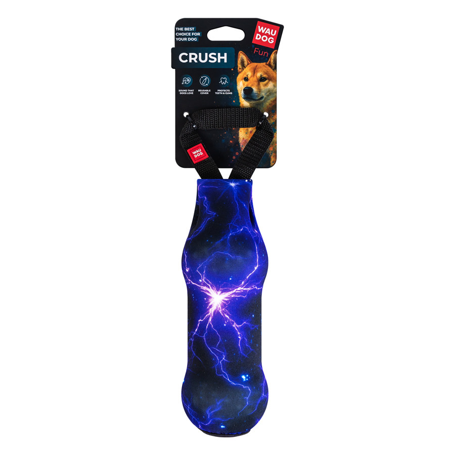 Іграшка для собак WAUDOG Fun Crush складається з трьох елементів: ПЕТ-пляшки, спеціальної кришки-пискавки та захисного чохла. Основою іграшки є пластикова пляшка, яка при стисканні створює характерний хрускіт, добре знайомий собакам. Цей звук привертає увагу та стимулює інтерес до гри. На шийку пляшки накручується кришка з вбудованою пискавкою, що додає ще один рівень звукової стимуляції. Пляшка вставлена в знімний чохол з поліестеру. Він захищає зуби та ясна собаки від пошкоджень під час активної гри. Зручна ручка на верхній частині чохла дозволяє легко тримати або тягнути іграшку. Як кришку, так і чохол можна зняти та використовувати з іншою стандартною пляшкою подібного розміру. Це дозволяє продовжити термін служби іграшки та адаптувати її до різних потреб.