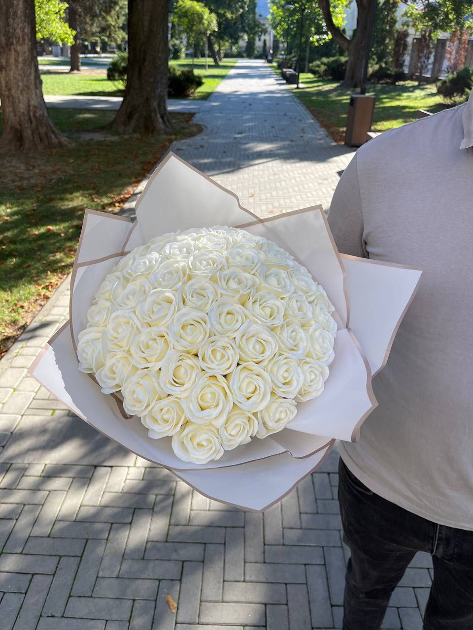Букет для неї з білими мильними трояндами 40 см 51 штука з блискітками Sellia
