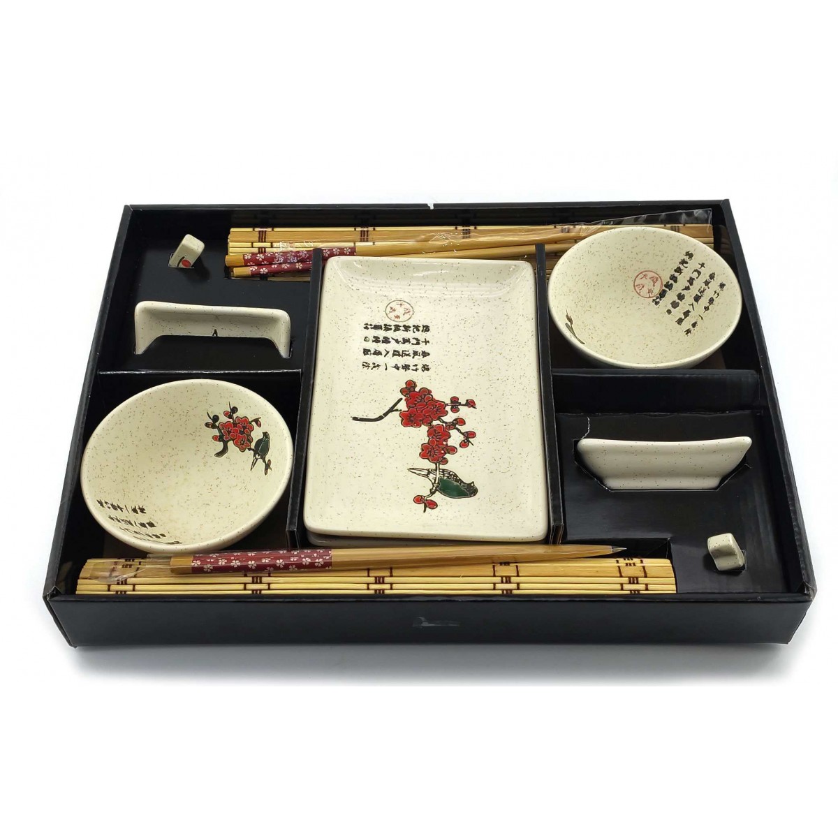 Набір розрахований на дві персони, в наборі дві керамічні тарілки прямокутної форми. Легкі і гладкі бамбукові палички, два комплекти, які не розмокають і не деформуються при правильному зберіганні. Дві керамічні підставки для паличок. Дві керамічні соусниці. Дві глибокі піали. Два бамбукових килимка. Набір упакований в картонну коробку з пластиковою кришкою. Кожен предмет набору має свою окрему комірку для зручного зберігання. Склад набору: - Тарілка (20 * 13 см) -2 шт. - Блюдце для соусу (9 * 6.5 см) - 2 шт. - Піала (11 * 5) - 2 шт. - Комплект бамбукових паличок для суші. - 2 комплекти. - Підставка під палички (5.5 * 1 см) - 2 шт. - Бамбуковий килимок (44 * 30) - 2 шт. - Подарункова картонна коробка (39х27,5х5,5 см)