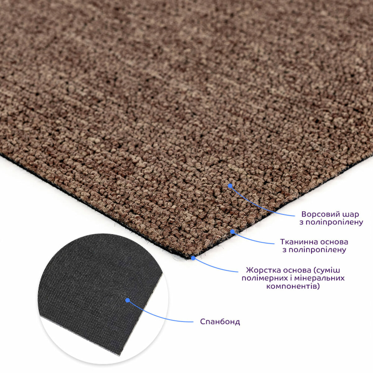 Плитка під ковролін без клейового шару - це сучасне модульне покриття розміром 500х500 мм і товщиною 3 мм, яке ідеально підходить для внутрішніх робіт. Шоколадний колір плитки надасть вашому інтер'єру стильного та затишного вигляду. Вона складається з високоякісних поліпропіленових волокон, які забезпечують міцність та довговічність покриття.