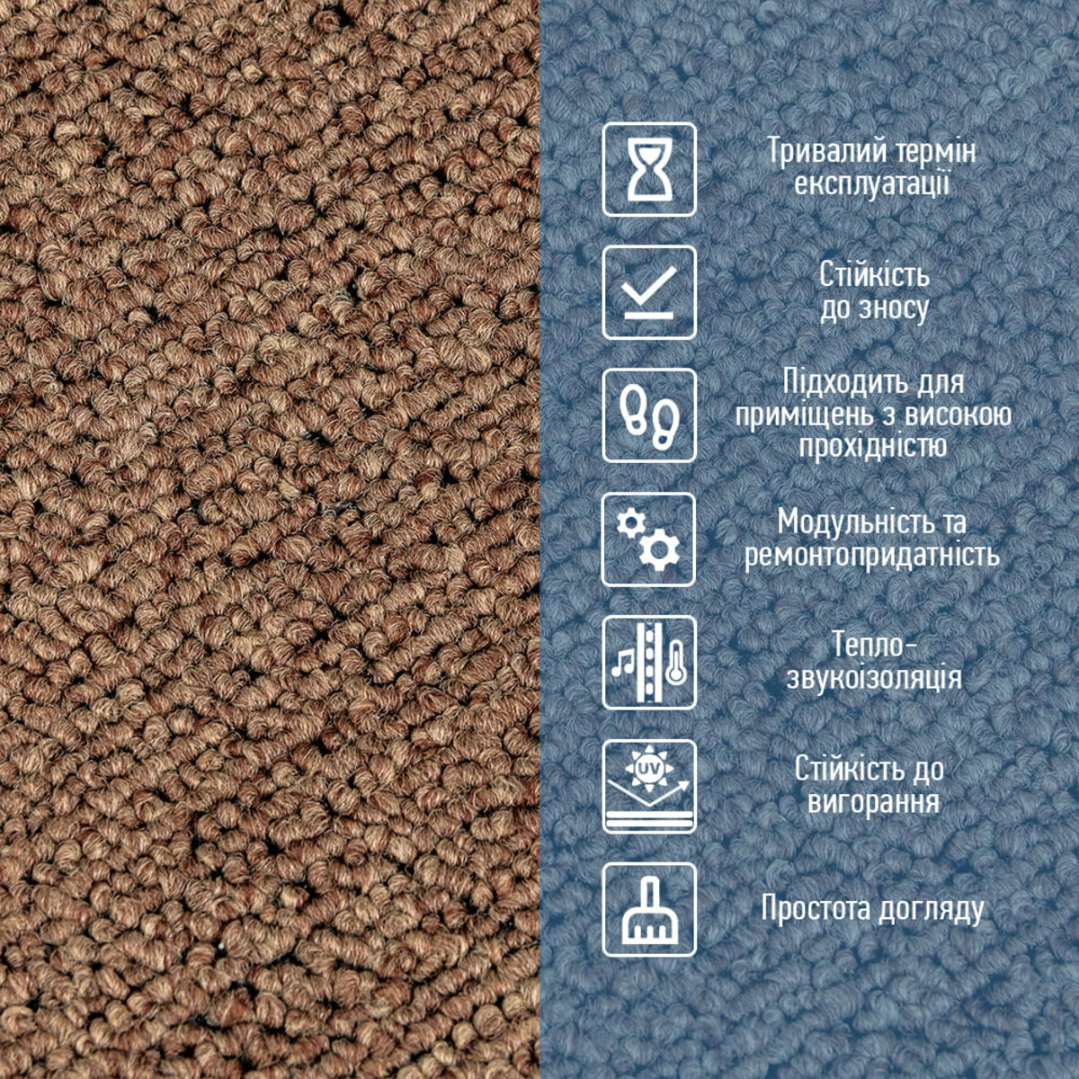 Ковролін у плитках легко укладається стик у стик, що дозволяє швидко та просто оновити будь-яке приміщення, чи то офіс, зал чи житловий простір. Завдяки відсутності клейового шару, монтаж стає ще простішим, а при необхідності плитку можна легко замінити.