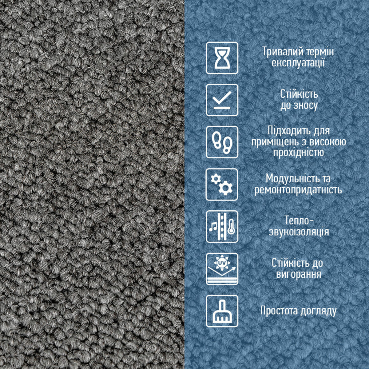 - Зносостійкість: Висока щільність ворсу забезпечує довговічність покриття.