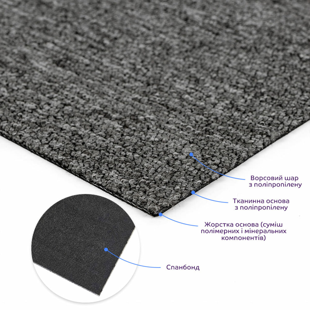 Плитка ковролін без клейового шару - це ідеальне рішення для тих, хто цінує якість та практичність. Плитка, що виготовляється з поліпропіленового волокна, має високу щільність ворсу, що робить її зносостійкою і вологостійкою. Розмір плитки складає 500х500х3 мм, а вага – 500 г, що дозволяє легко монтувати її на будь-які поверхні. Завдяки модульному дизайну ви зможете створювати різні комбінації, підбираючи ідеальне рішення для вашого інтер'єру.