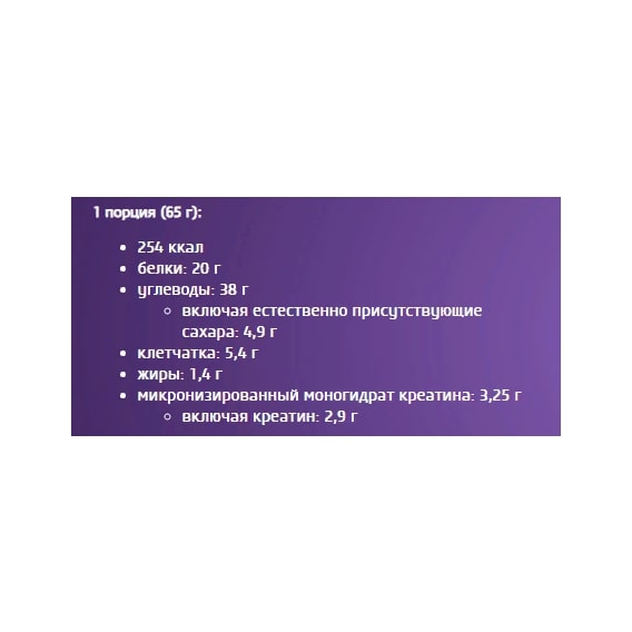 В 1 ПОРЦИИ:16 г сывороточного протеина;44 г BTN Carb Matrix™ (декстроза, мальтодекстрин, фруктоза);3250 мг моногидрата креатина;0 г жира.