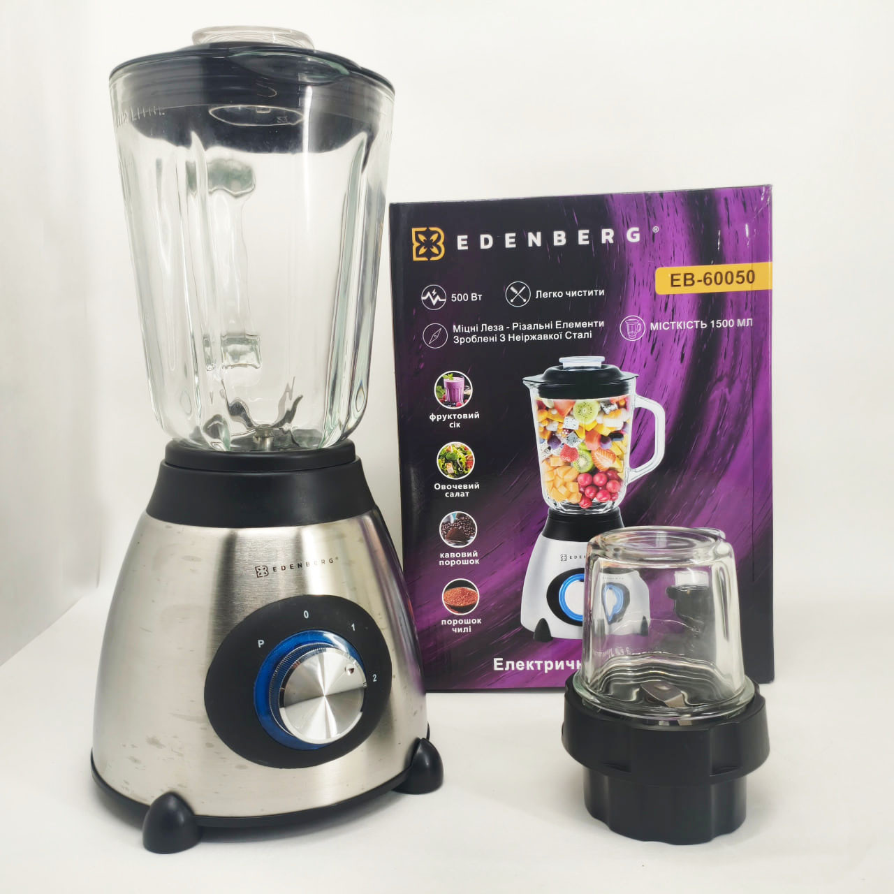 Також у цьому блендері є кавомолка, яка допоможе вам розмелити каву, спеції та горіхи. Пристрій оснащений системою захисного блокування, яка запобігає випадковому ввімкненню. Живлення 220-240 В, 50-60 Гц. Edenberg EB-60050 - чудовий помічник на вашій кухні для здорового та смачного харчування!