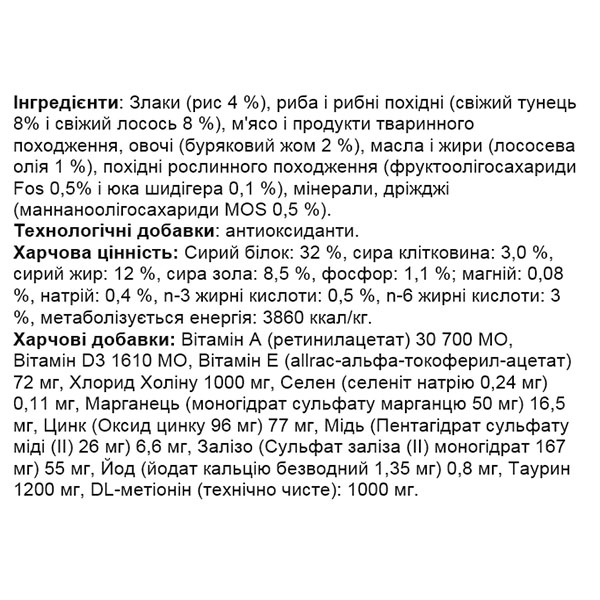 Содержит таурин и L-карнитин – аминокислоты, отвечающие за переваривание жиров, сохранение острого зрения, здоровье сердца и нервных тканей любимца