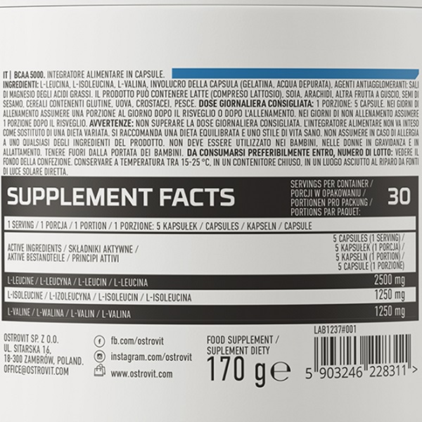 OstroVit BCAA 5000 мг - высококачественные аминокислоты в стандартном соотношении. Благодаря капсулированной форме удобны в приеме. Кроме того, оболочка капсулы защищает содержимое от желудочного сока. Таким образом, вы получаете максимум усвоенных аминокислот.