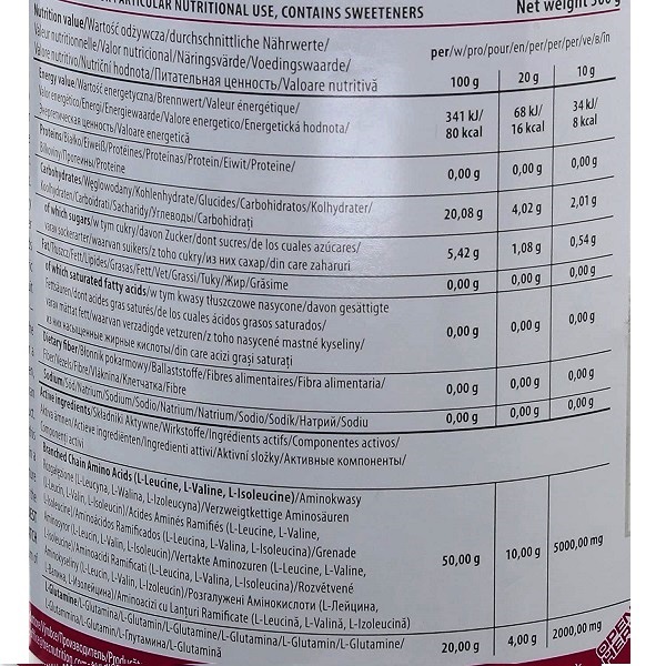 Ингредиенты: аминокислоты с разветвленной цепью (L-лейцин; L-валин; L-изолейцин) (50%); мальтодекстрин; L-глютамин (20%); регулятор кислотности - лимонная кислота; вкусовые добавки; подсластитель - сукралоза; цвет - бета-каротин.